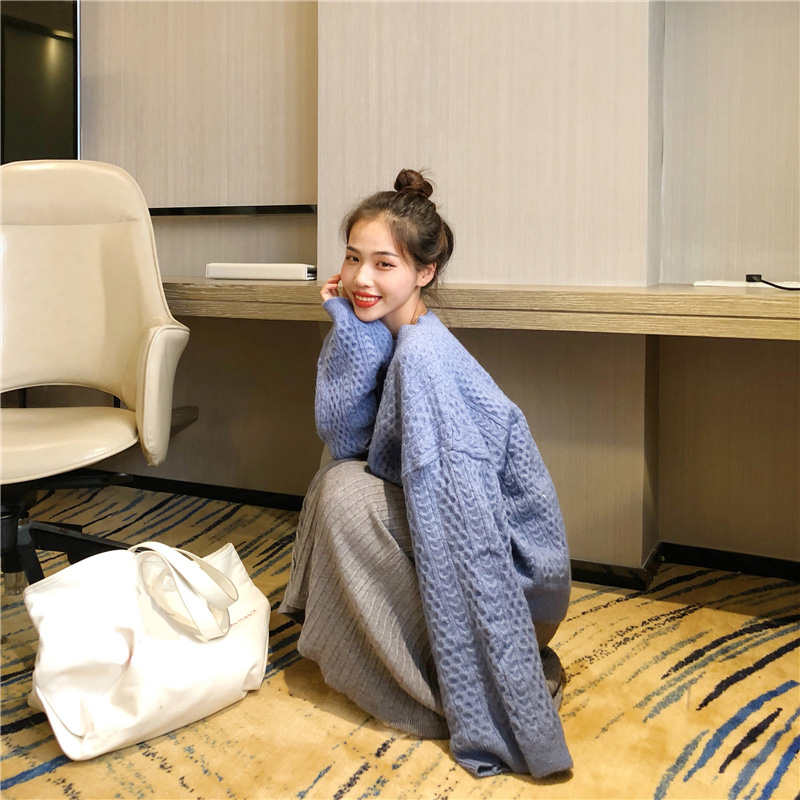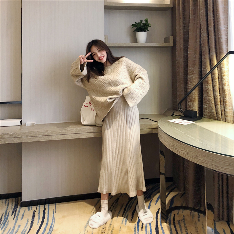 chic慵懶風時尚套裝新款寬松麻花毛衣+百搭高腰中長款針織百褶裙