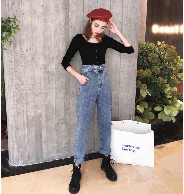 秋季韓版高腰兩粒扣牛仔褲復古水洗做舊寬松闊腿褲直筒褲九分褲女