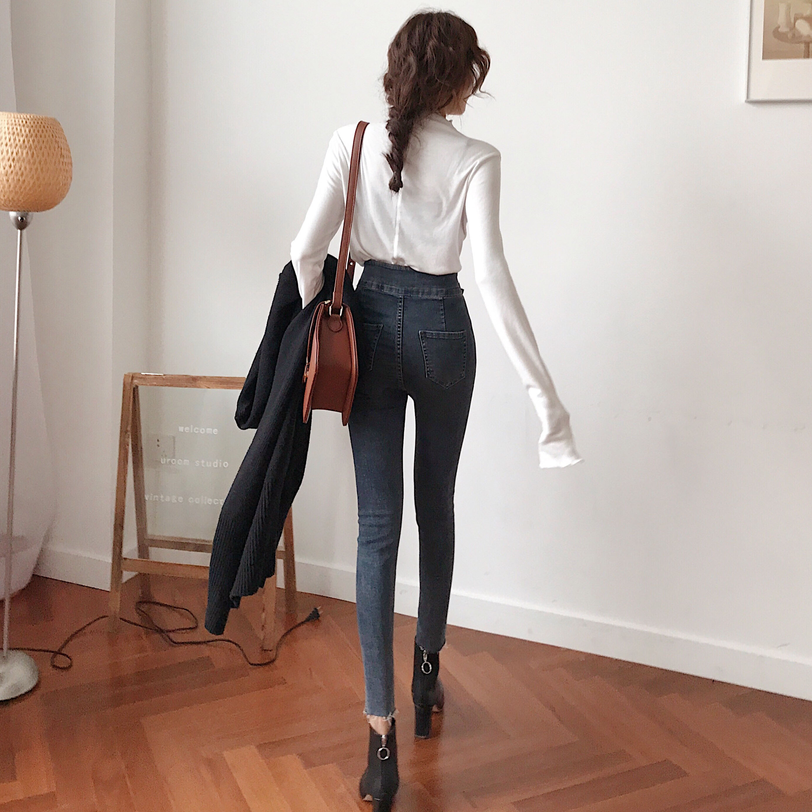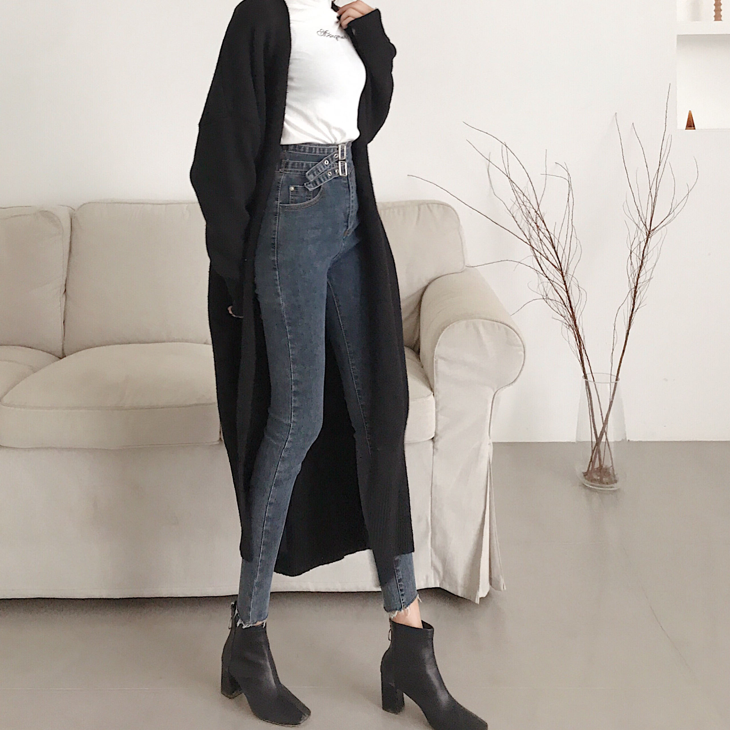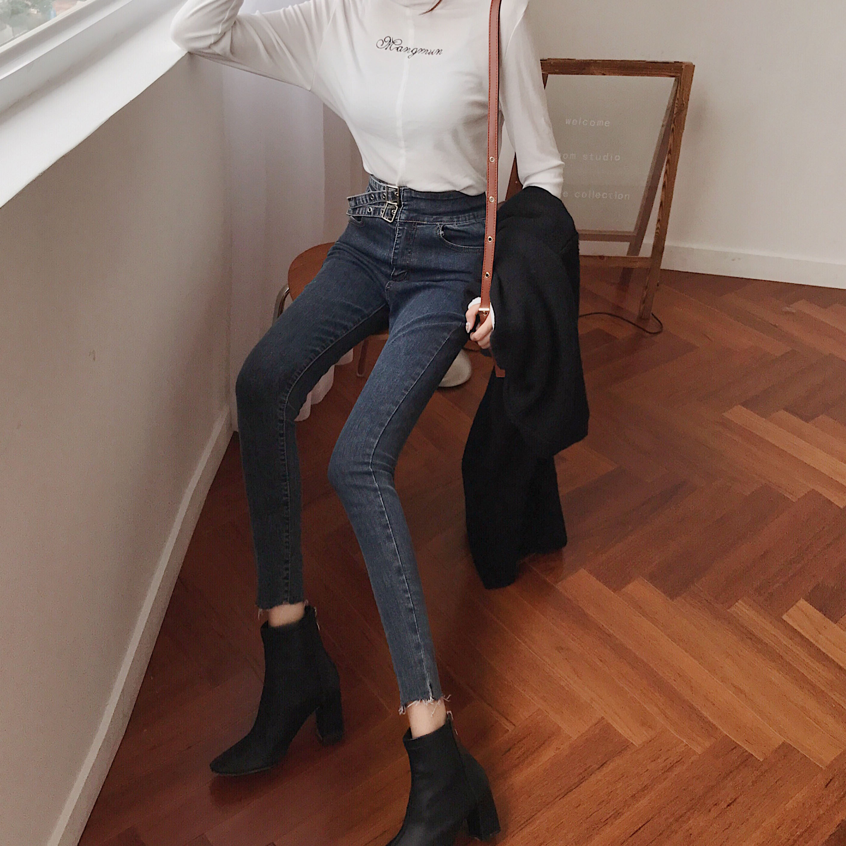 韓國顯瘦chic風高腰牛仔褲女秋冬2018新款百搭修身彈力小腳鉛筆褲