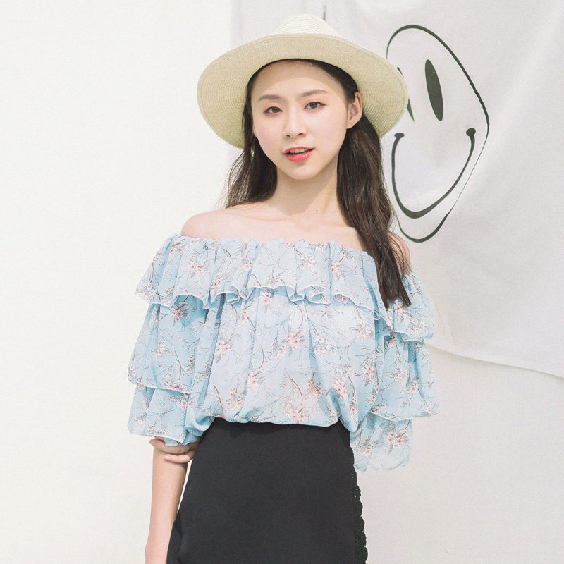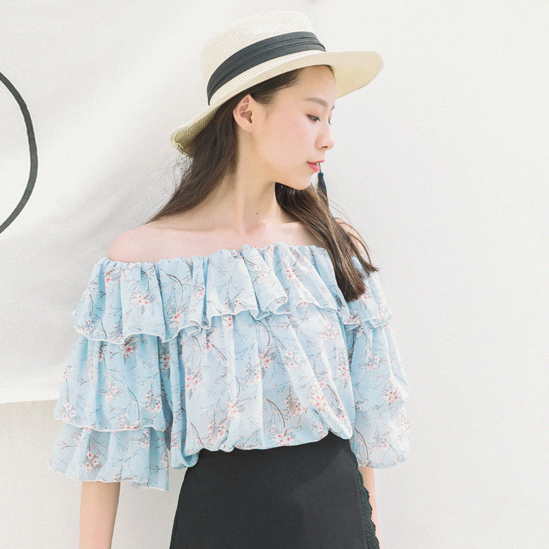 / 夏裝新款女裝韓版一字領露肩雪紡衫寬松顯瘦荷葉邊短袖上衣潮