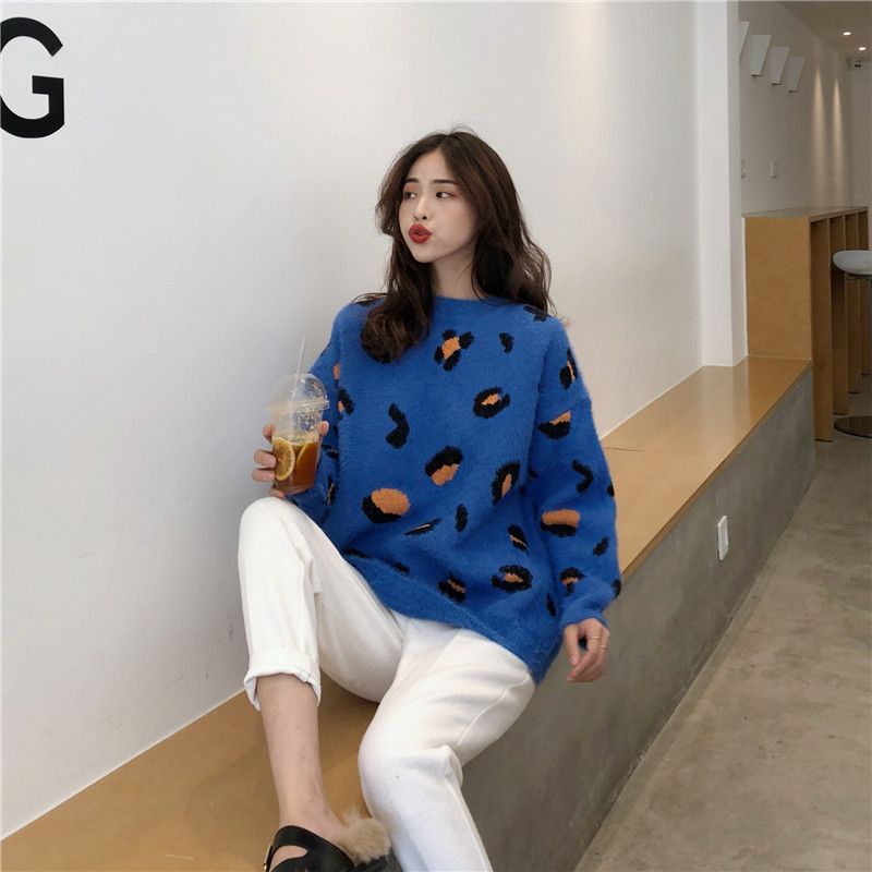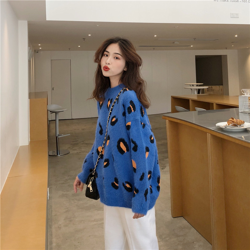 / 圓領豹寬松慵懶風紋毛毛斑點針織衫高腰直筒蘿卜毛呢褲時尚套裝女
