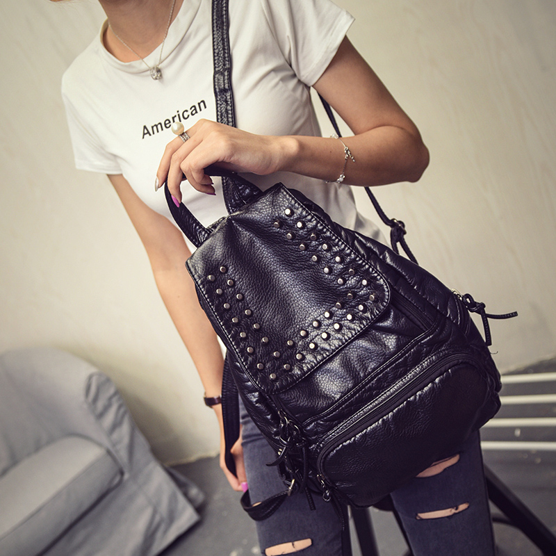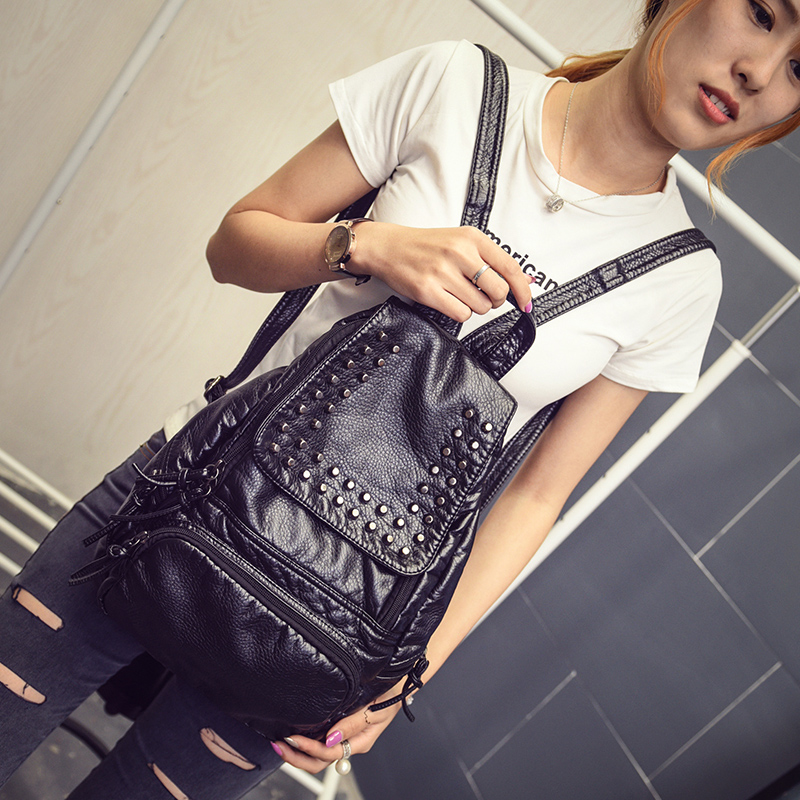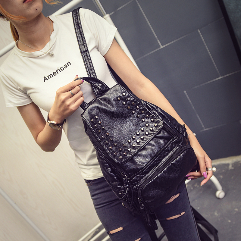 新款韓版時尚鉚釘雙肩包女水洗皮時尚背包學生休閑旅行背包潮