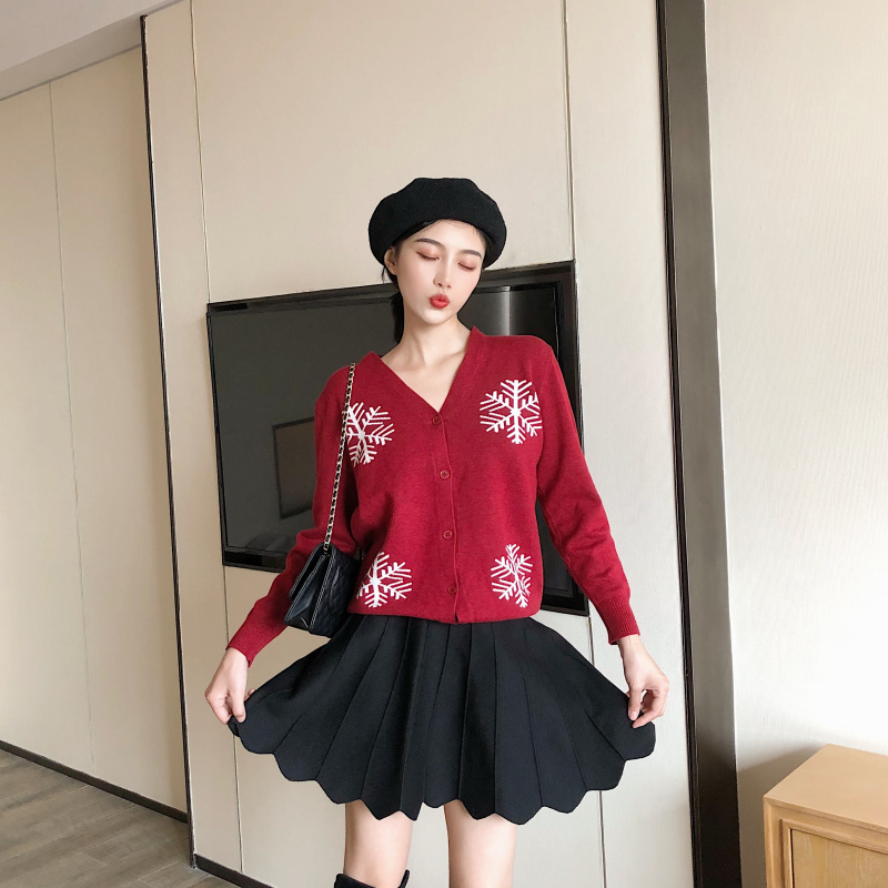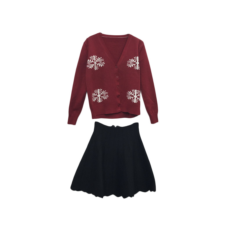 / 韓版chic女神套裝新款修身百搭雪花針織衫開衫+高腰半身裙兩件套