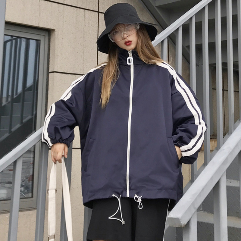 / 春季新款女裝寬松復古高領運動休閑外套女學生兩條杠長袖風衣開衫