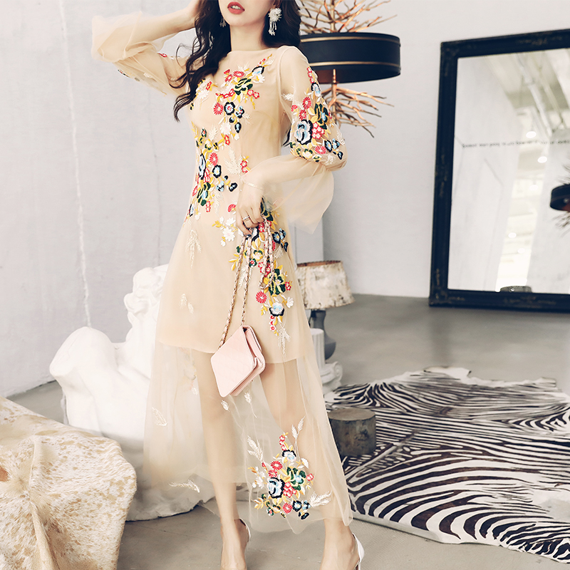 名媛網紗氣質慵懶連衣裙女2018秋季新款重工刺繡高腰公主長裙子