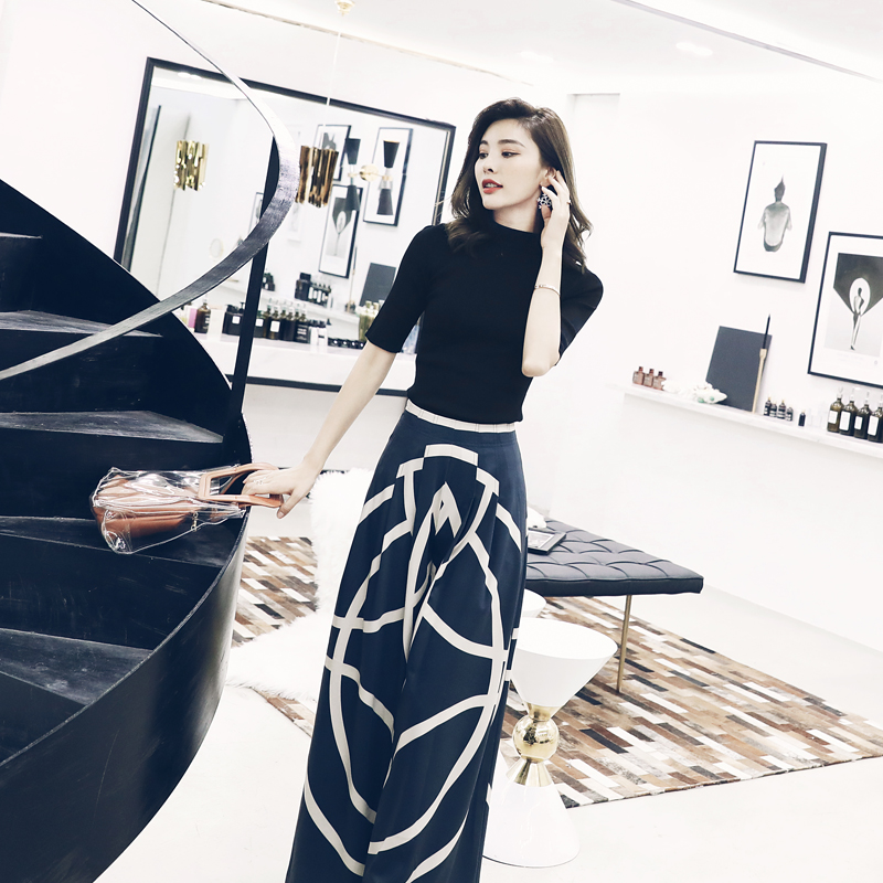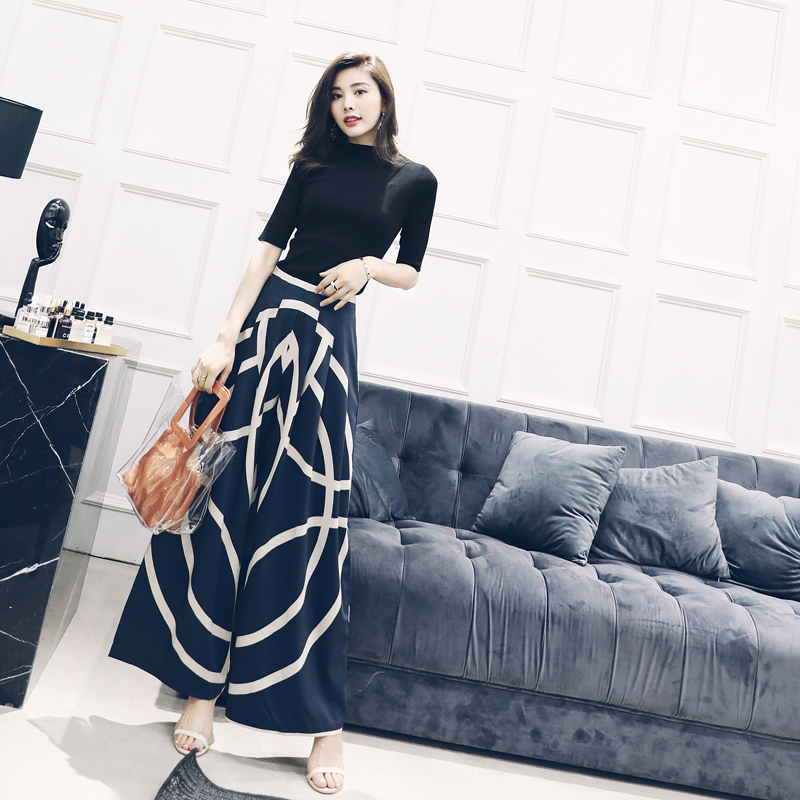 / S秀名媛女神范心機套裝2018新款上衣印花垂感闊腿褲子時尚兩件套