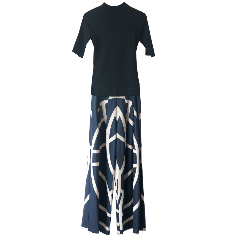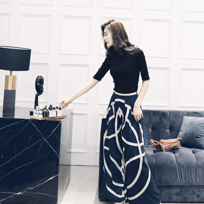 S秀名媛女神范心機套裝2018新款上衣印花垂感闊腿褲子時尚兩件套