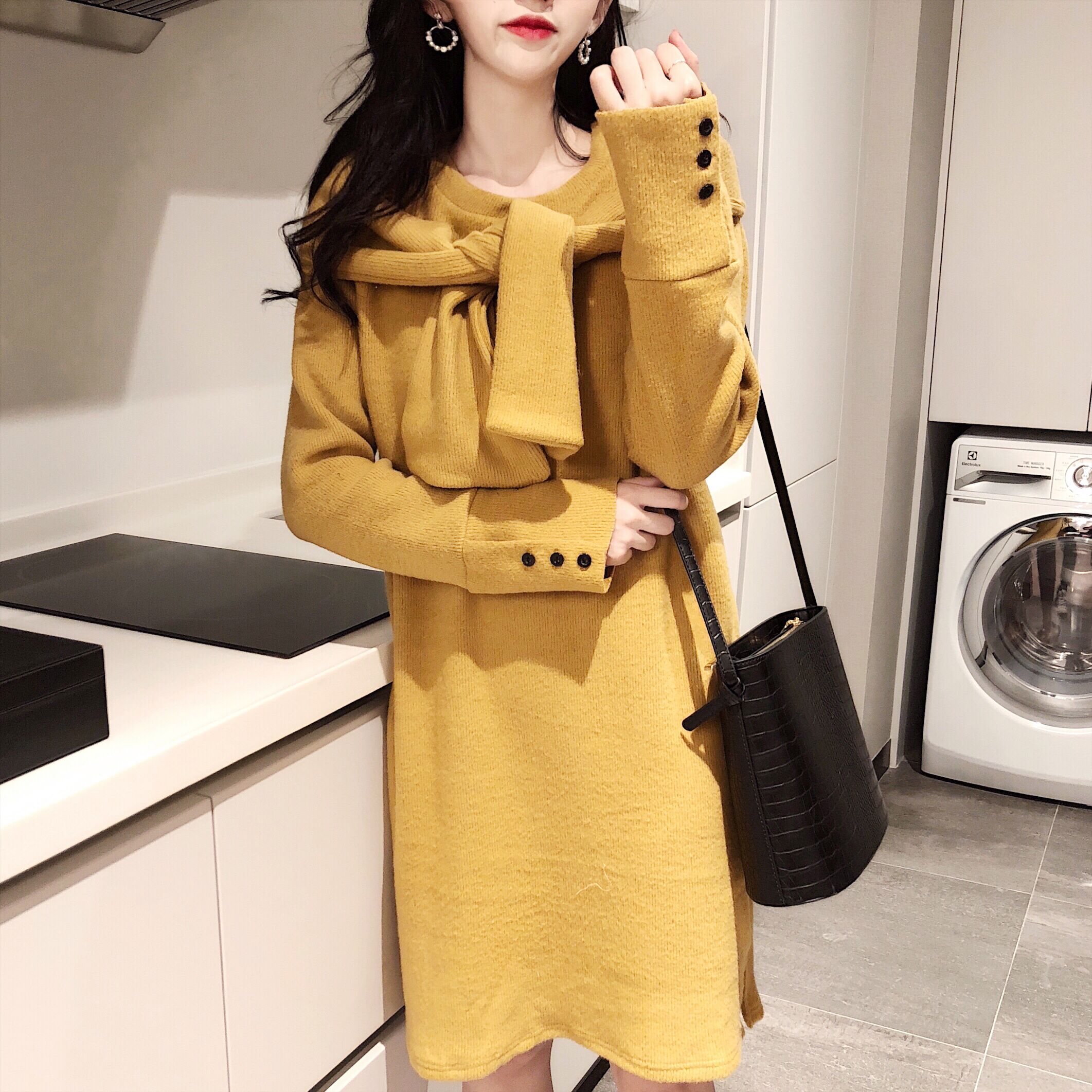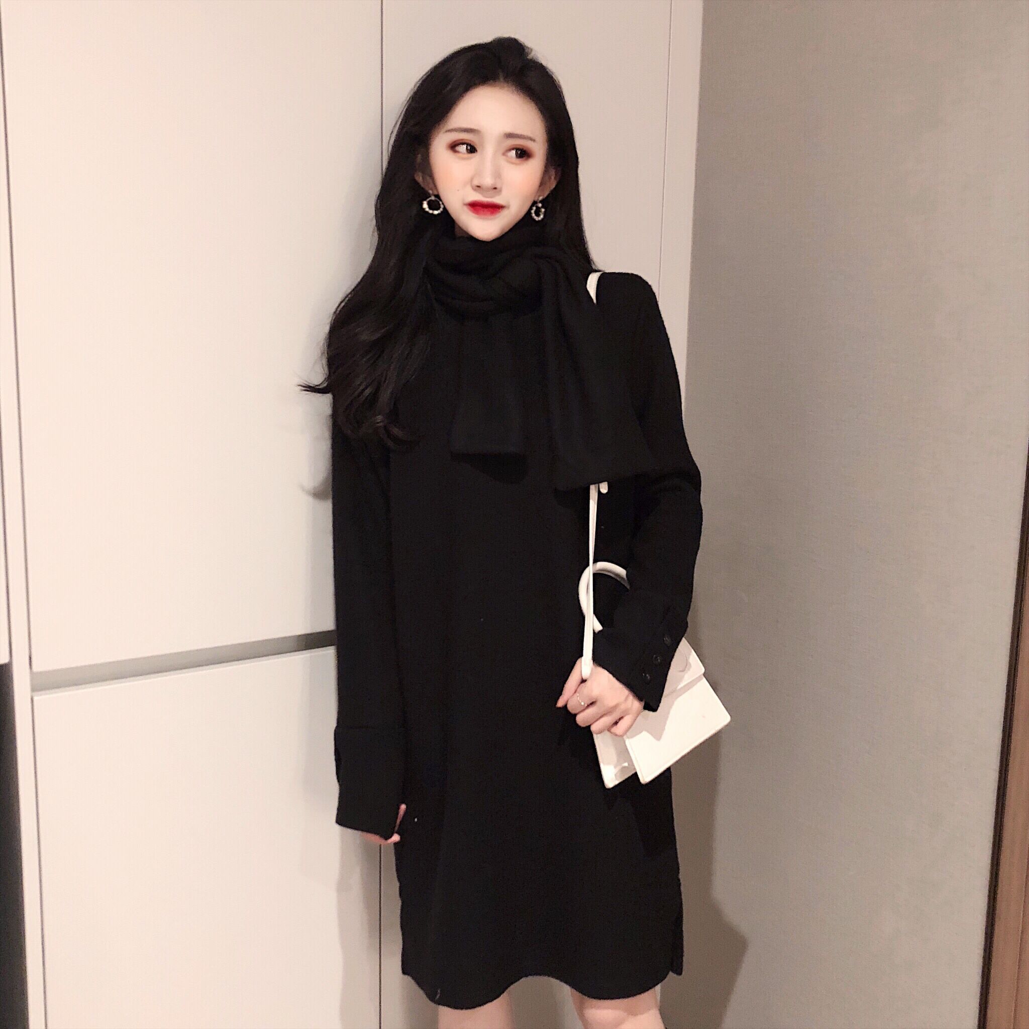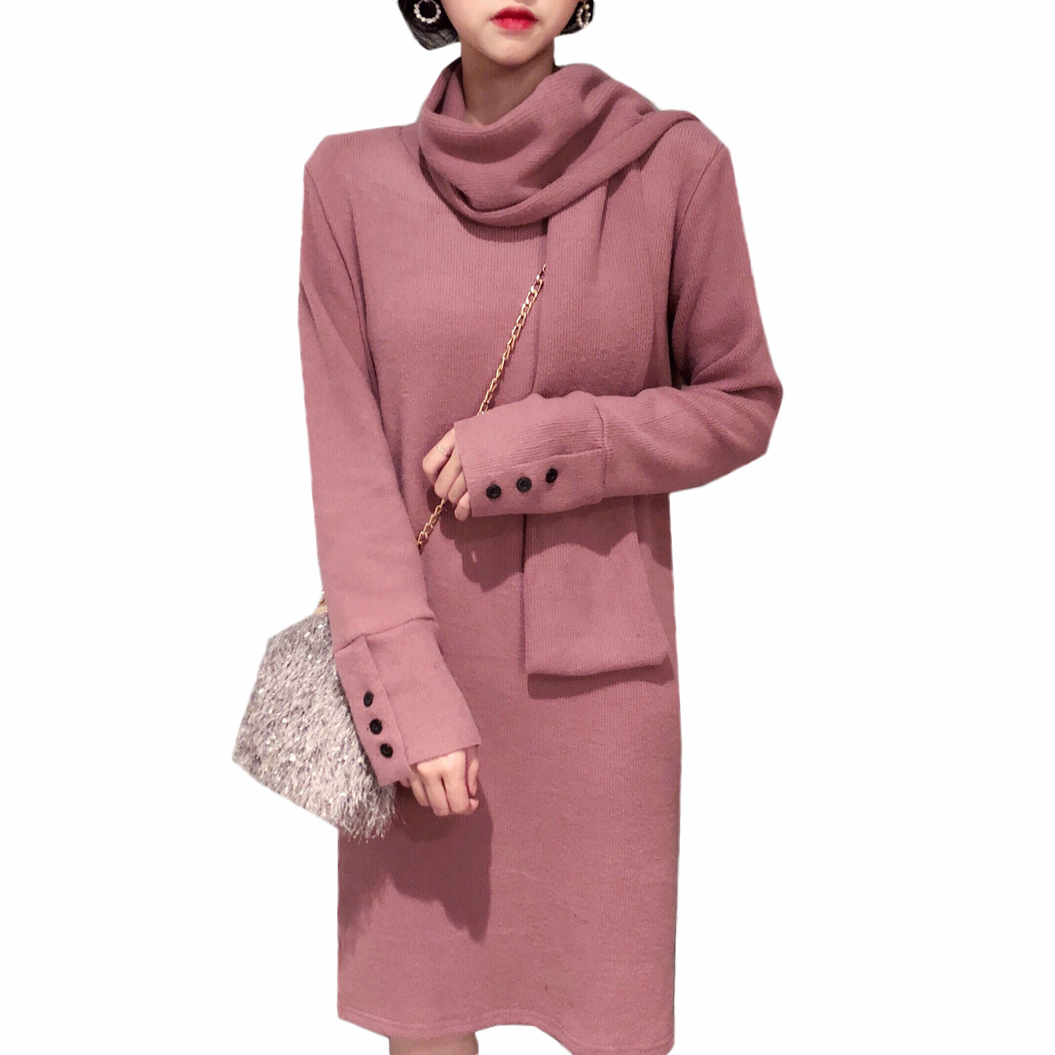 初冬溫柔風毛衣裙女冬裝2018新款女中長款寬松連衣裙女(配圍巾)