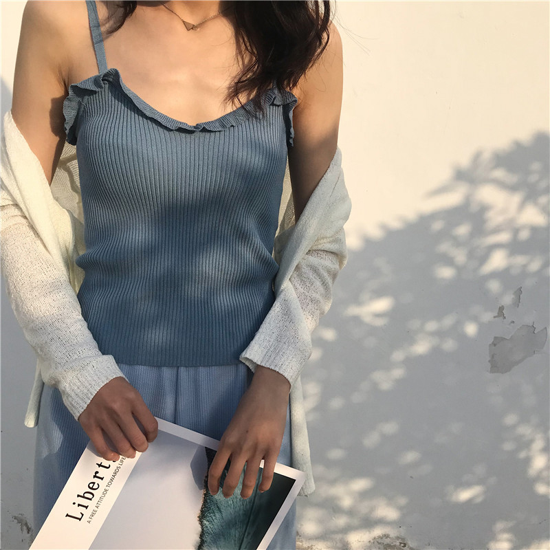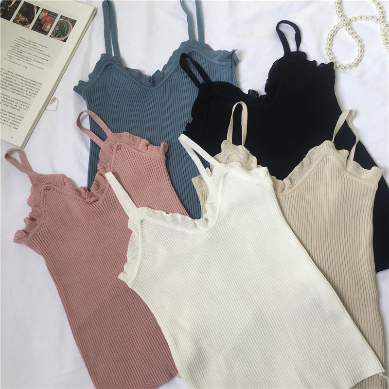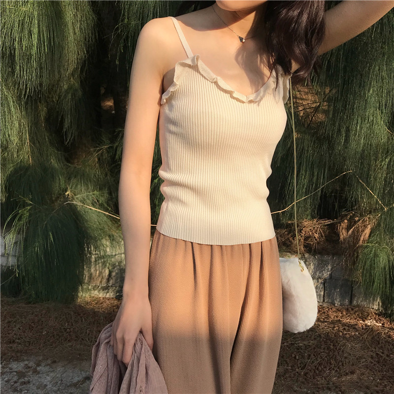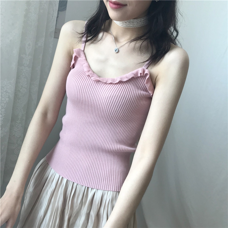 夏季新款女裝小花邊學生短款修身顯瘦百搭打底針織吊帶外穿小背心