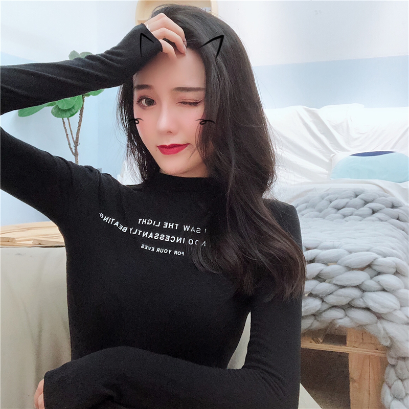 韓版時尚百搭秋裝女2018新款印花小高領修身顯瘦長袖T恤打底衫潮
