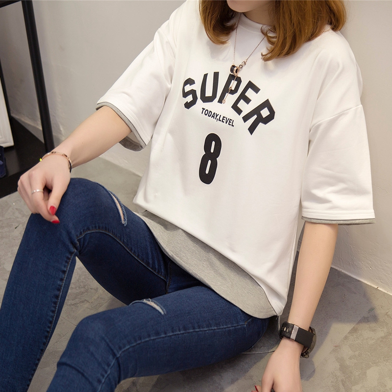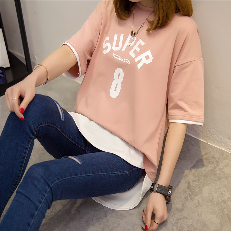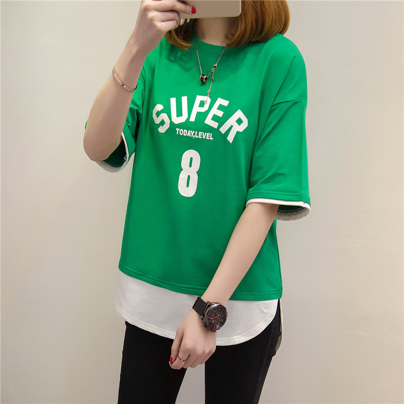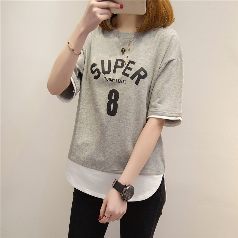 / 夏裝新款女裝上衣短袖t恤女套裝假兩件韓版寬松學生體恤衫女