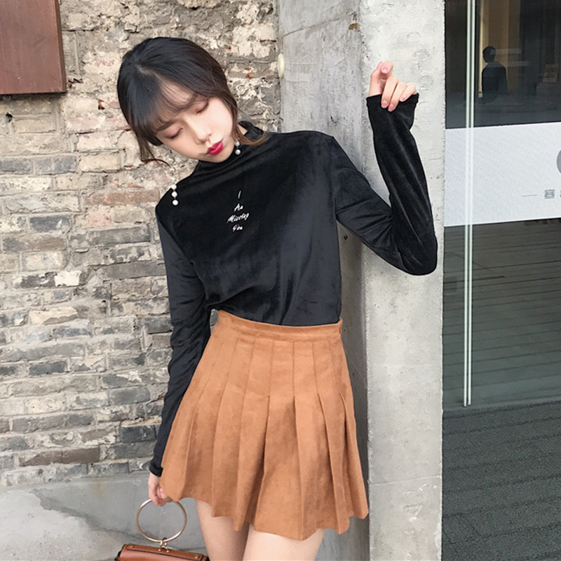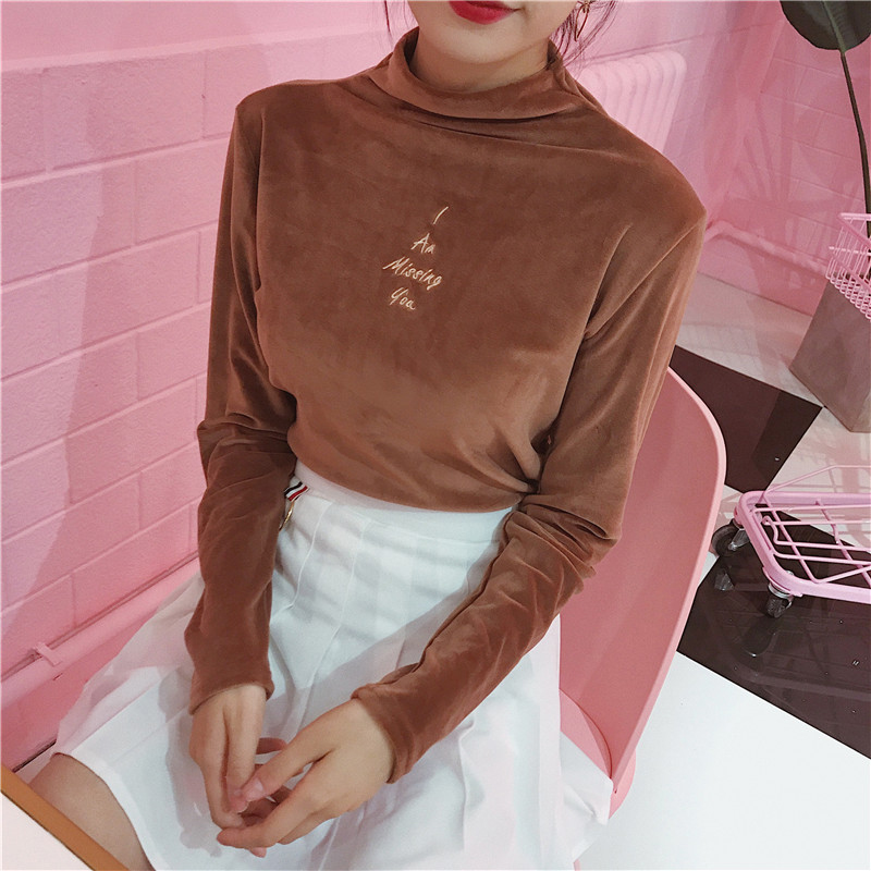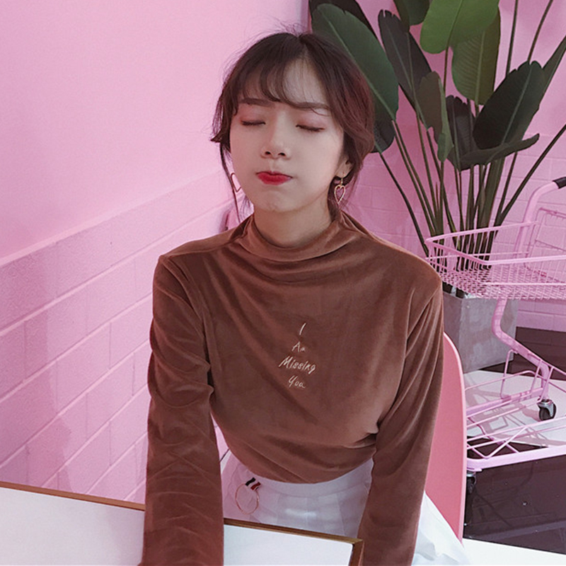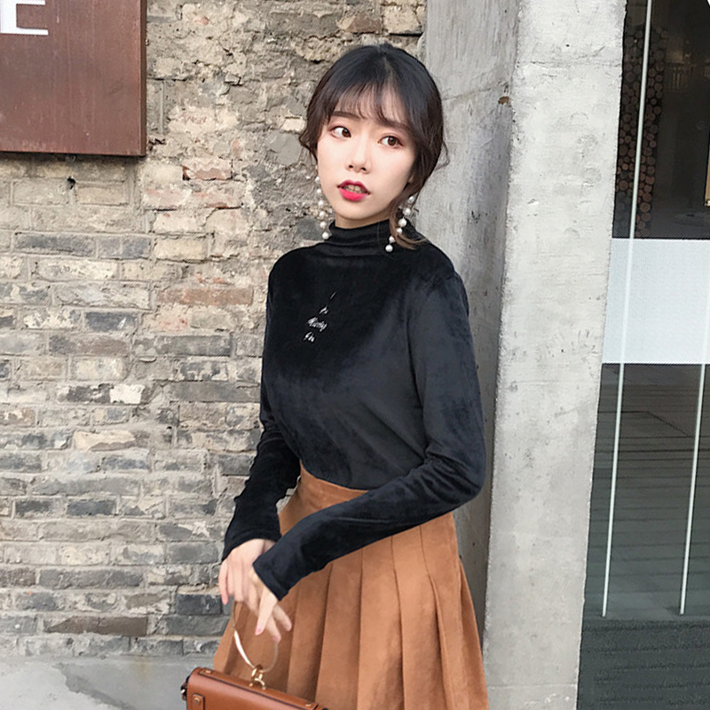 / 半高領打底衫秋裝女新款復古刺繡絲絨長袖T恤港味修身黑色上衣潮