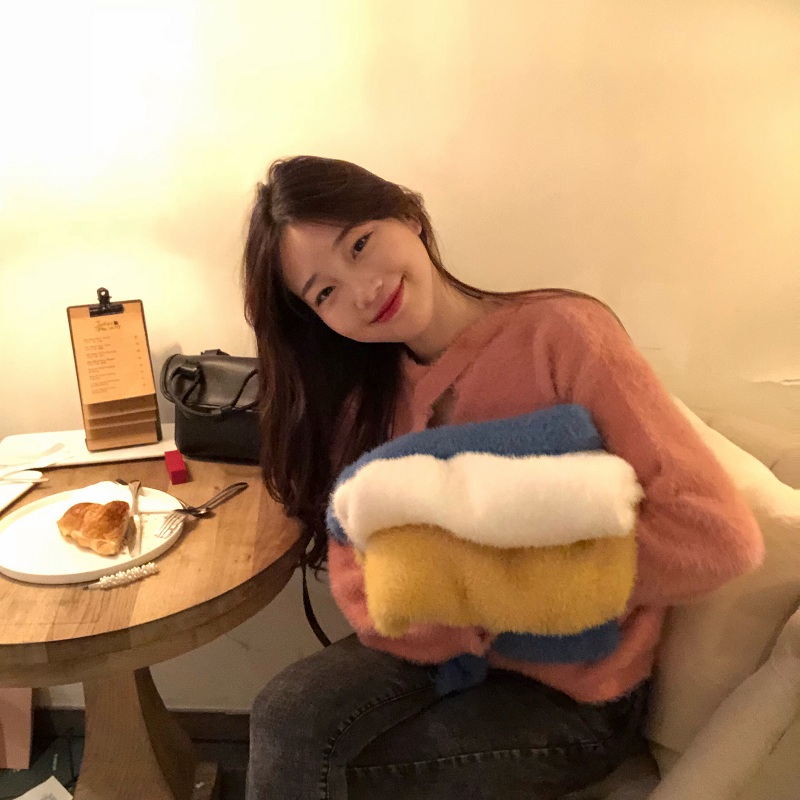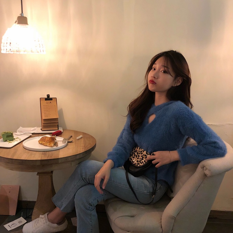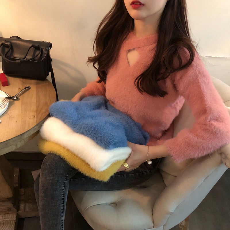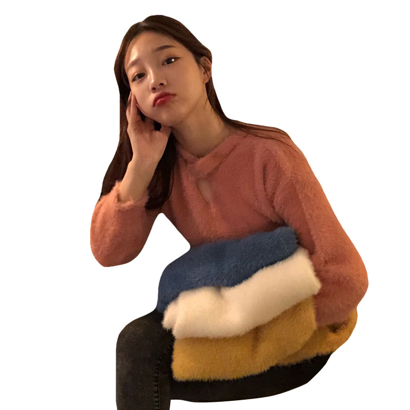 / 秋冬女裝韓版修身顯瘦純色加厚鏤空交叉領毛毛套頭針織衫毛衣上衣