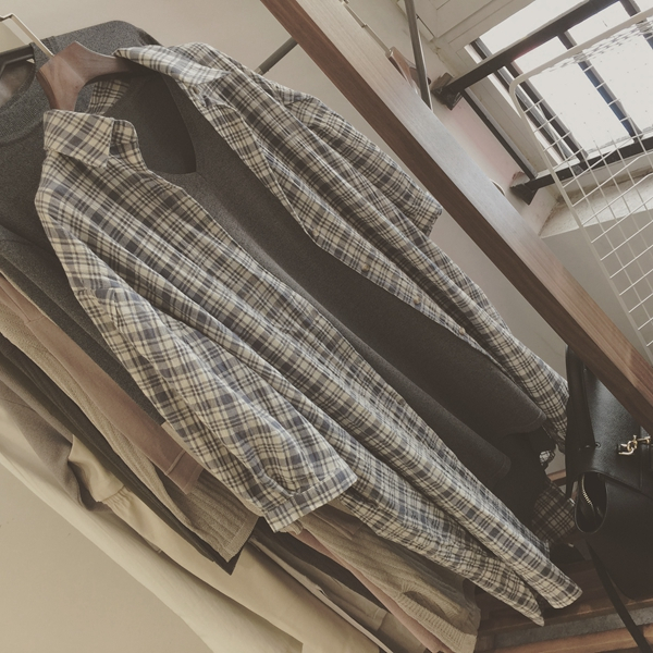 / 韓版學院風寬松格子襯衣 百搭減齡七分袖娃娃衫中長款襯衫女夏裝