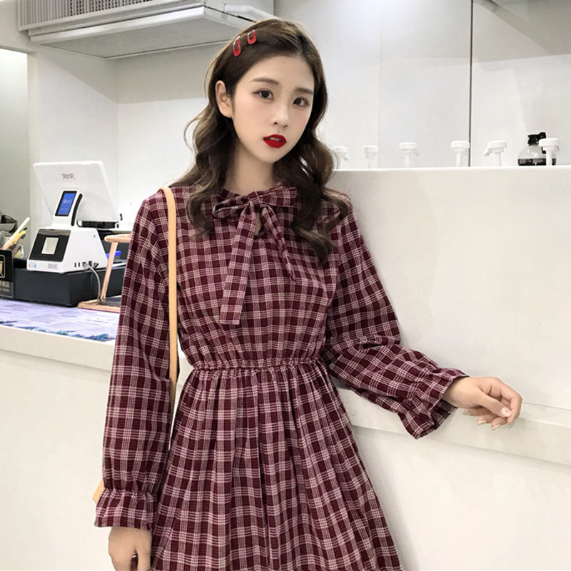 學院風格子連衣裙女新款秋裝復古學生中長裙少女清新荷葉邊A字裙