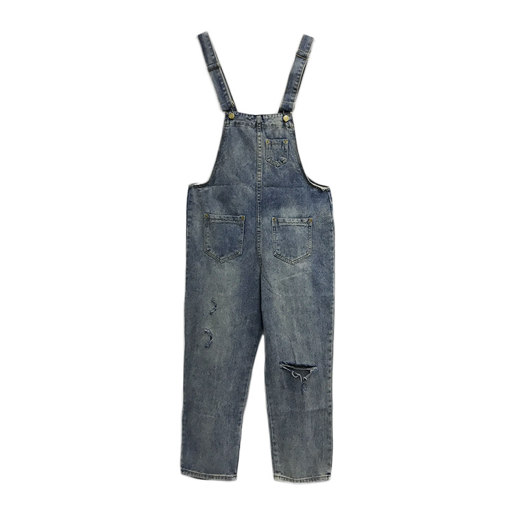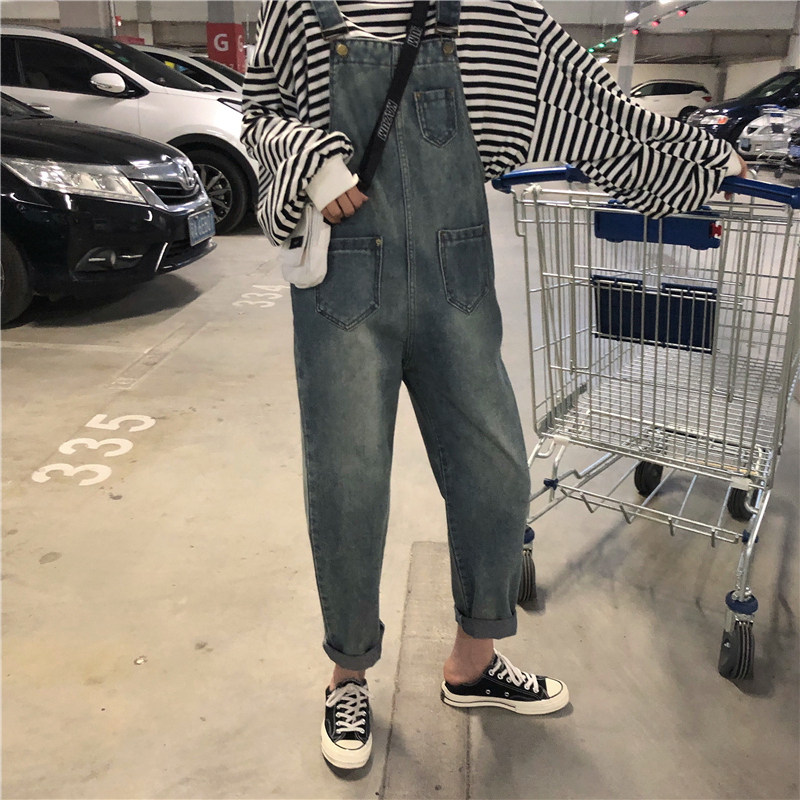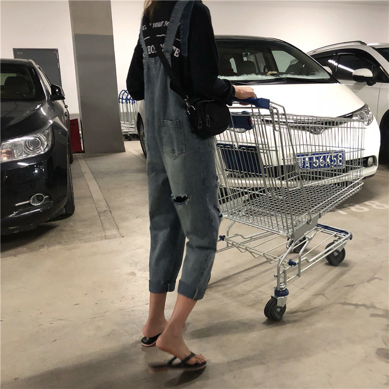 時尚百搭牛仔褲女春秋2018新款韓版顯瘦修身口袋破洞牛仔背帶褲潮