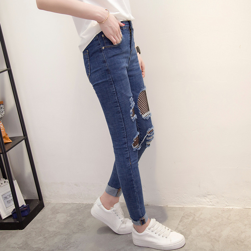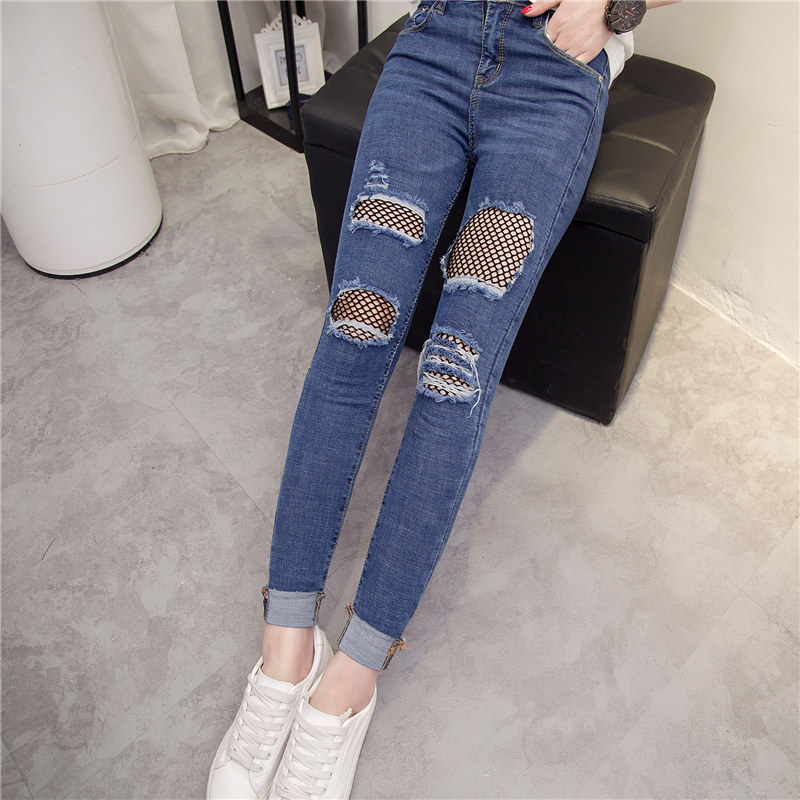 / 漁網破洞牛仔褲女春季女裝新款潮修身韓版顯瘦前部小腳褲長褲