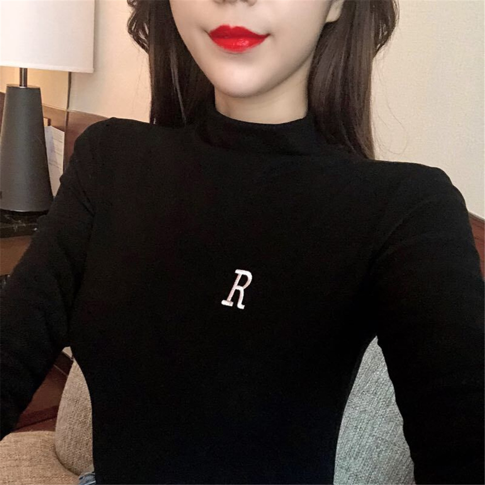 chic早秋上衣女2018新款韓版T恤修身顯瘦百搭半高領刺繡打底衫潮