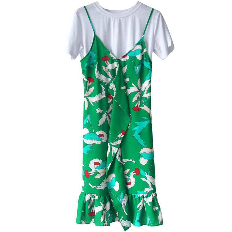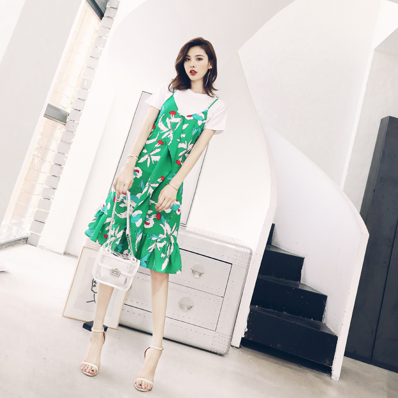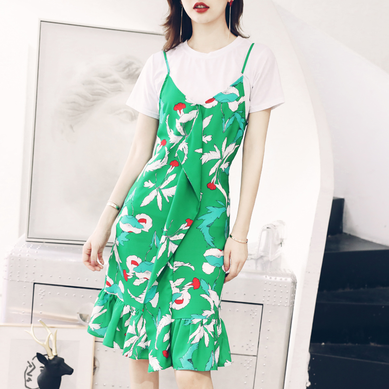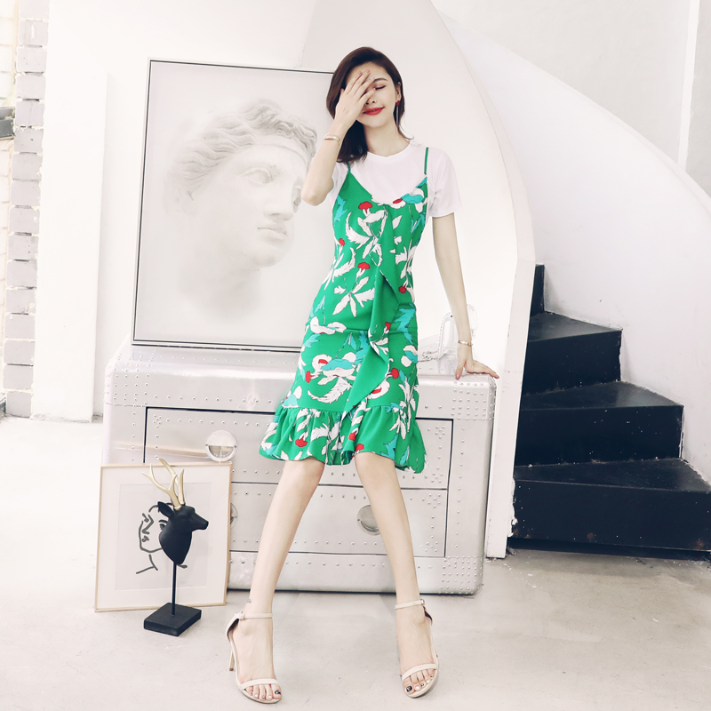 小心機時尚套裝中長款荷葉邊印花碎花連衣裙吊帶裙白色t恤兩件套