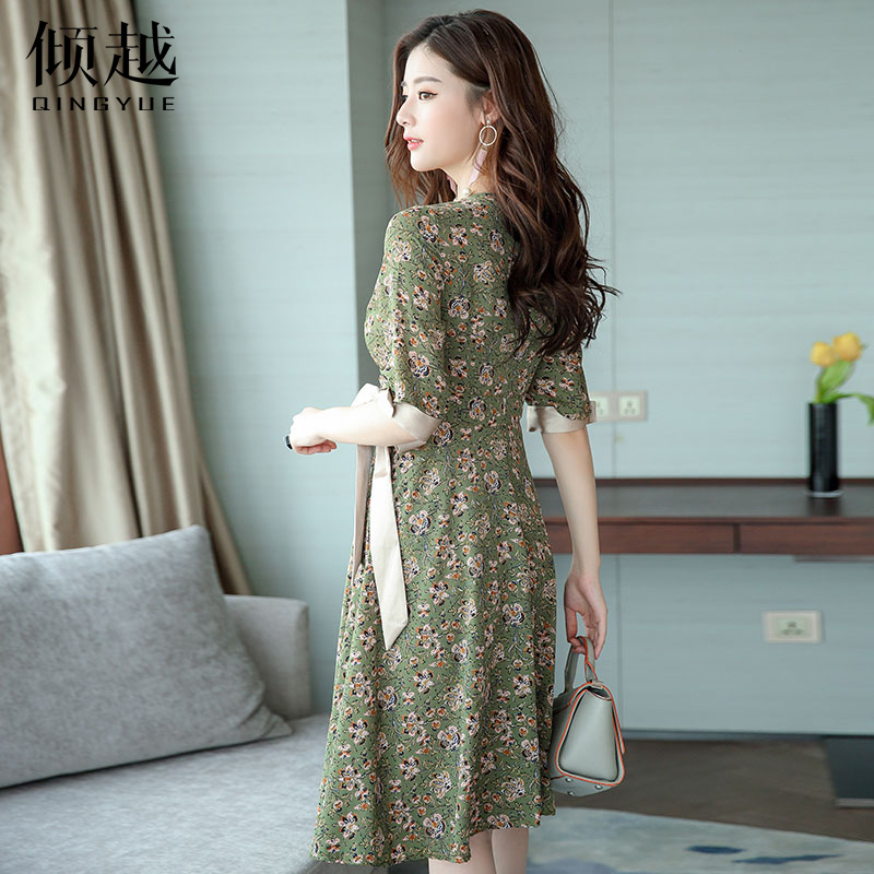碎花裙子夏季新款2017顯瘦韓版中長款收腰v領印花短袖雪紡連衣裙