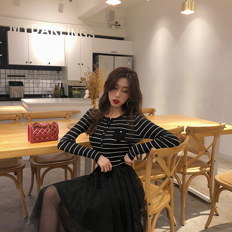chic早秋毛衣慵懶2018新款女紐扣套頭修身打底衫上衣長袖針織衫潮