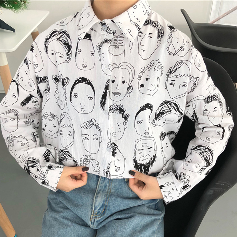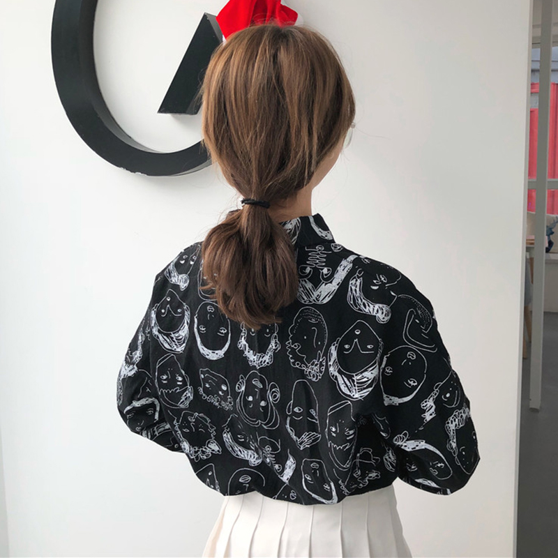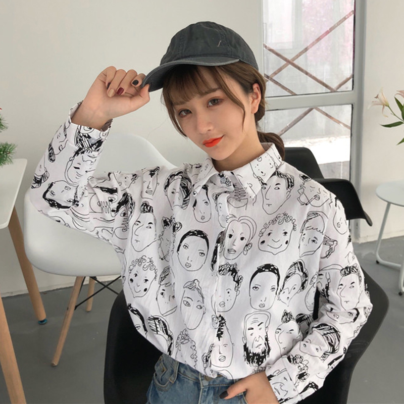 / 港味復古卡通圖案寬松長袖襯衫秋裝新款冷系女裝襯衣學生休閑上衣