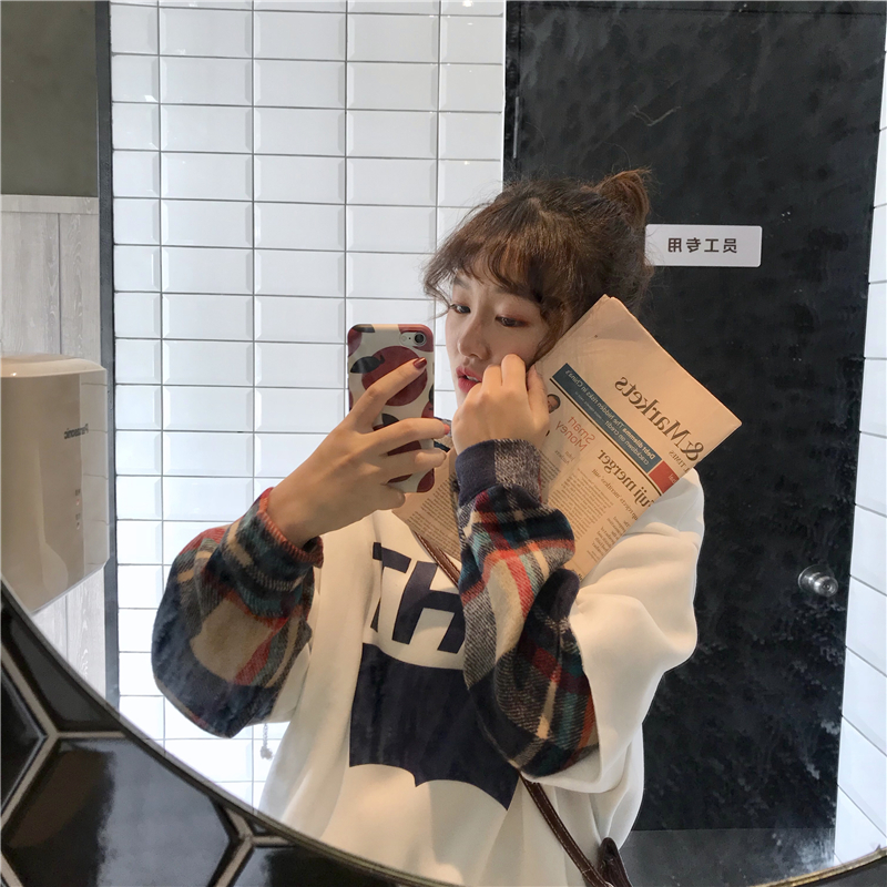 / 秋冬女裝韓版中長款原宿風寬松字母格子拼接連帽超火衛衣上衣外套