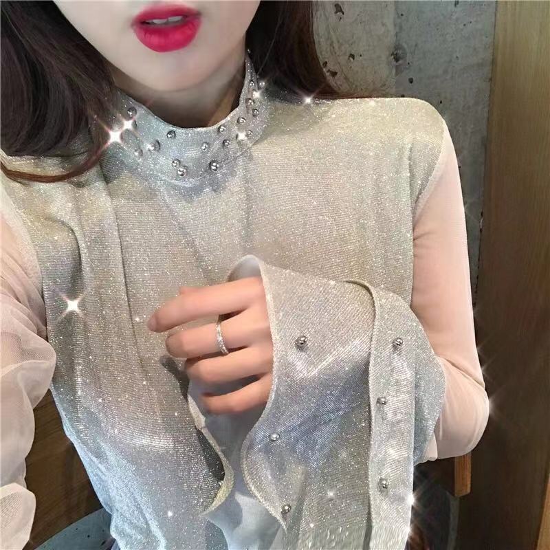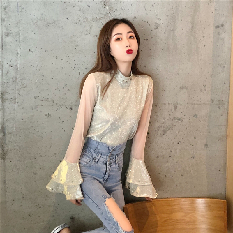 / 2018秋冬新款韓版上衣立領釘珠透視網紗拼接荷葉邊喇叭袖打底衫女