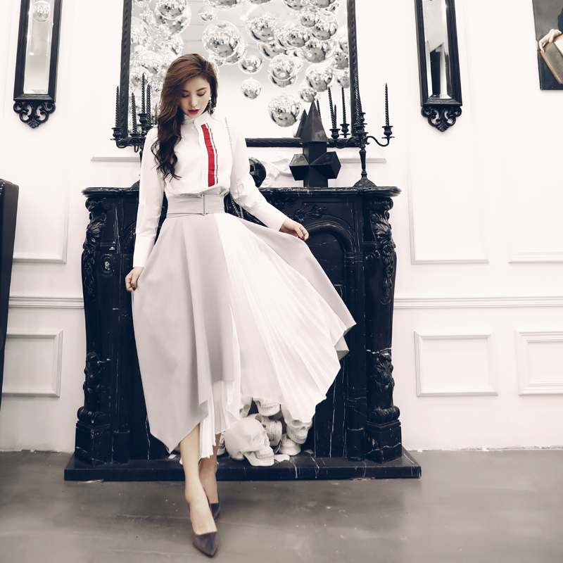 / 秋季女套裝2018新款氣質時髦長袖襯衫高腰不規則拼接半身裙兩件套