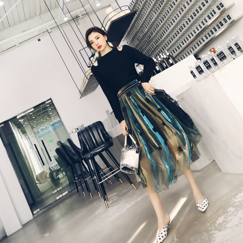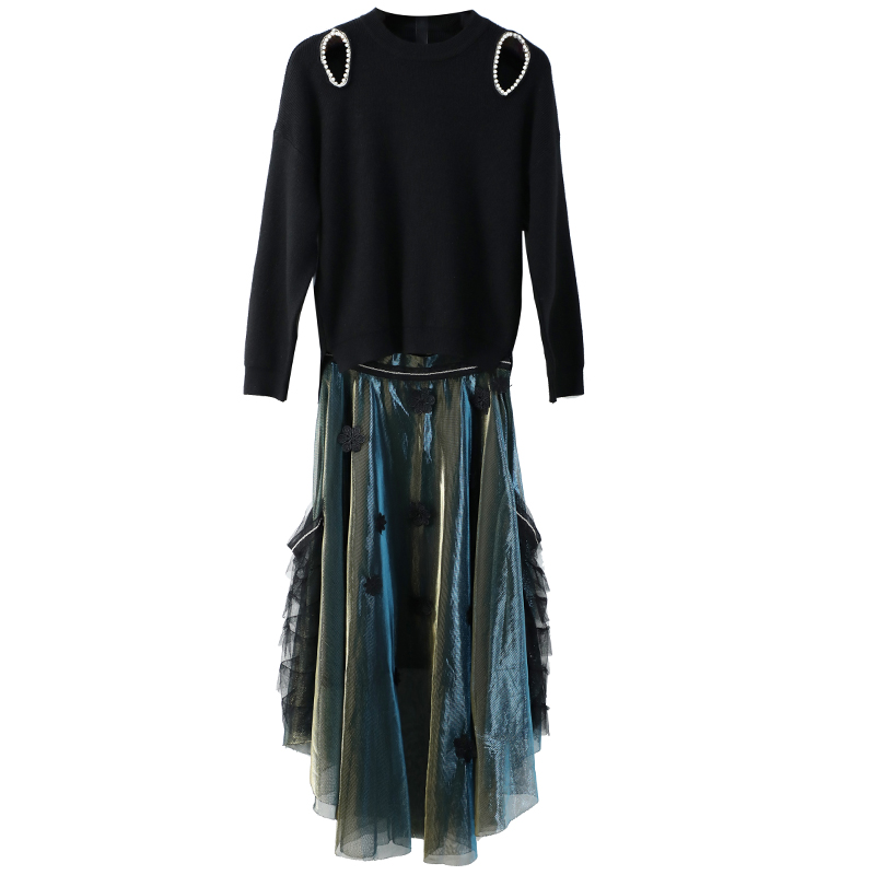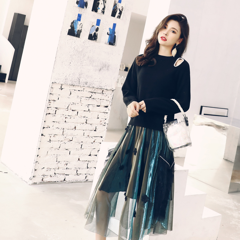 / 2018秋冬裝女新款韓版港味氣質長袖毛衣針織衫兩件套裝網紗連衣裙