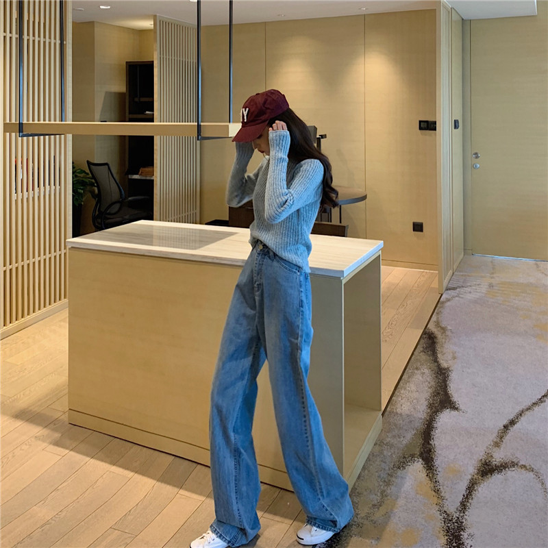 港味復古chic風褲子慵懶風寬松顯瘦直筒褲高腰顯瘦微喇叭牛仔長褲