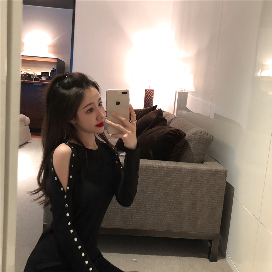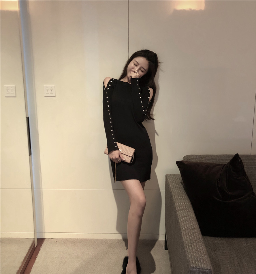 2018早秋新款港味紐扣露肩小心機設計感性感冷淡風針織連衣裙女潮