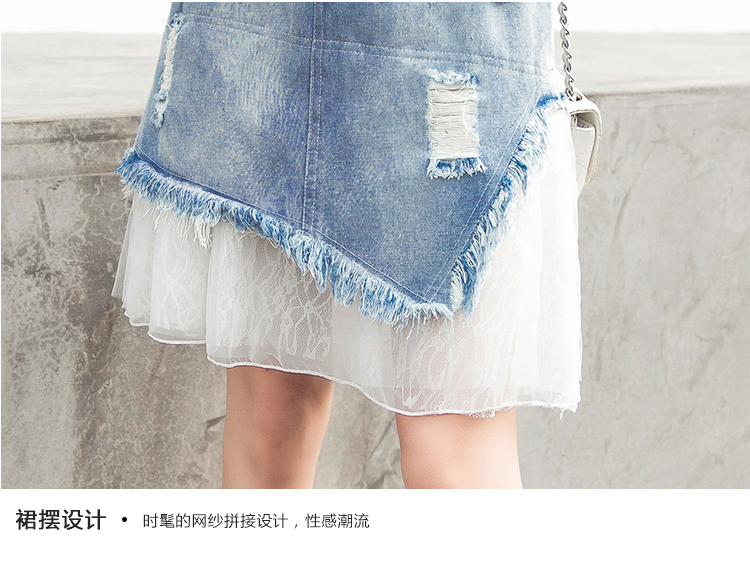 / 夏韓版高腰破洞牛仔裙半身裙女網紗拼接不規則A字裙包臀短裙半裙