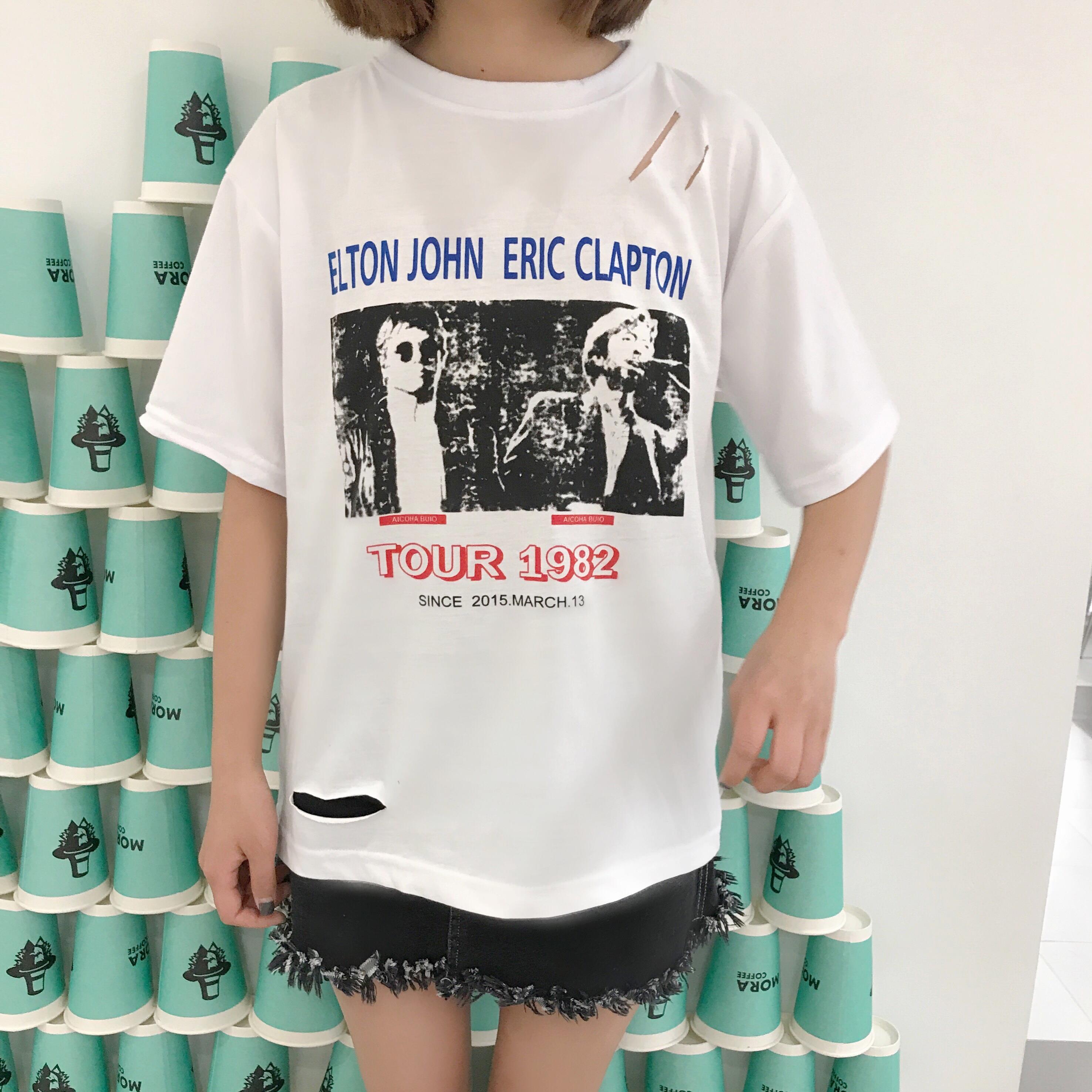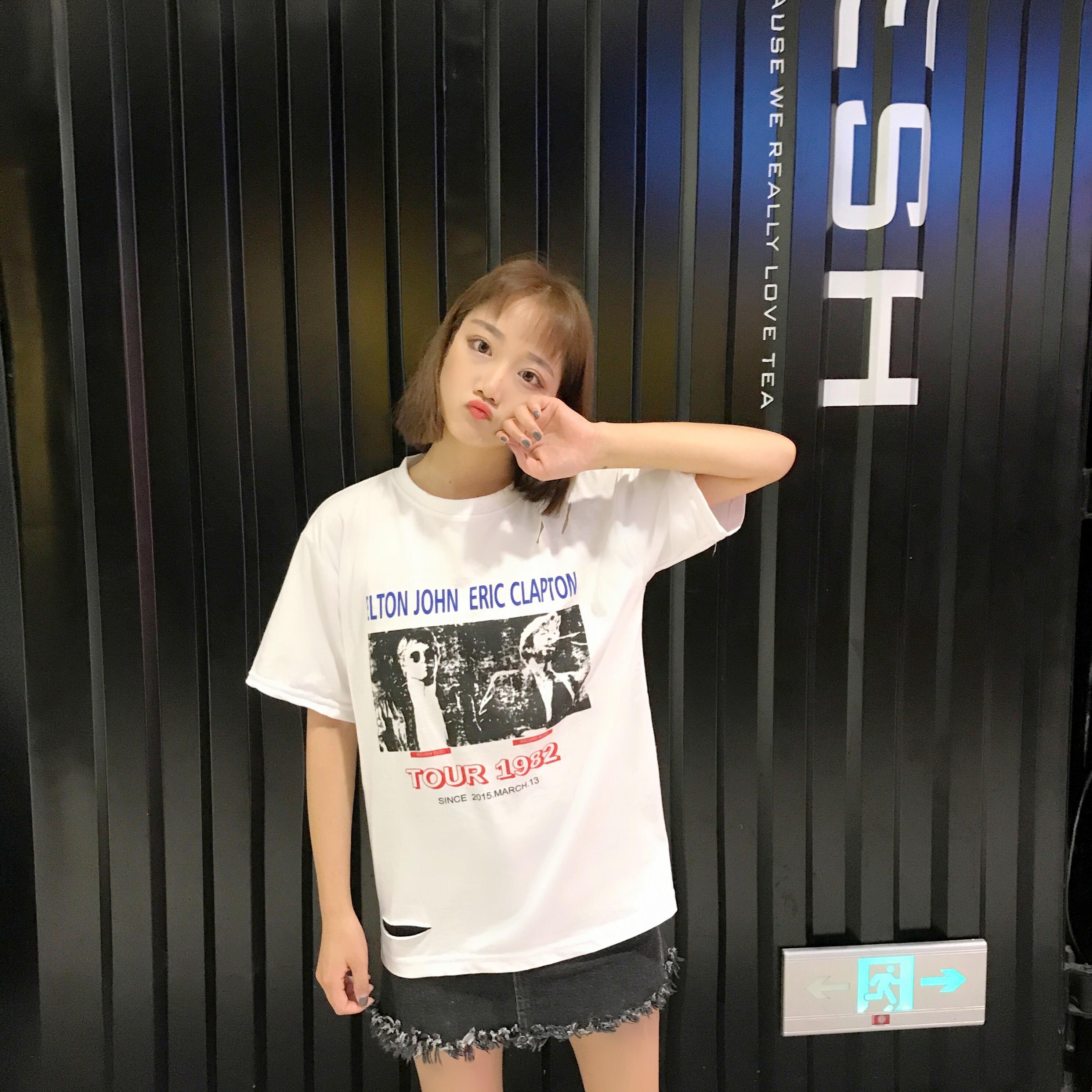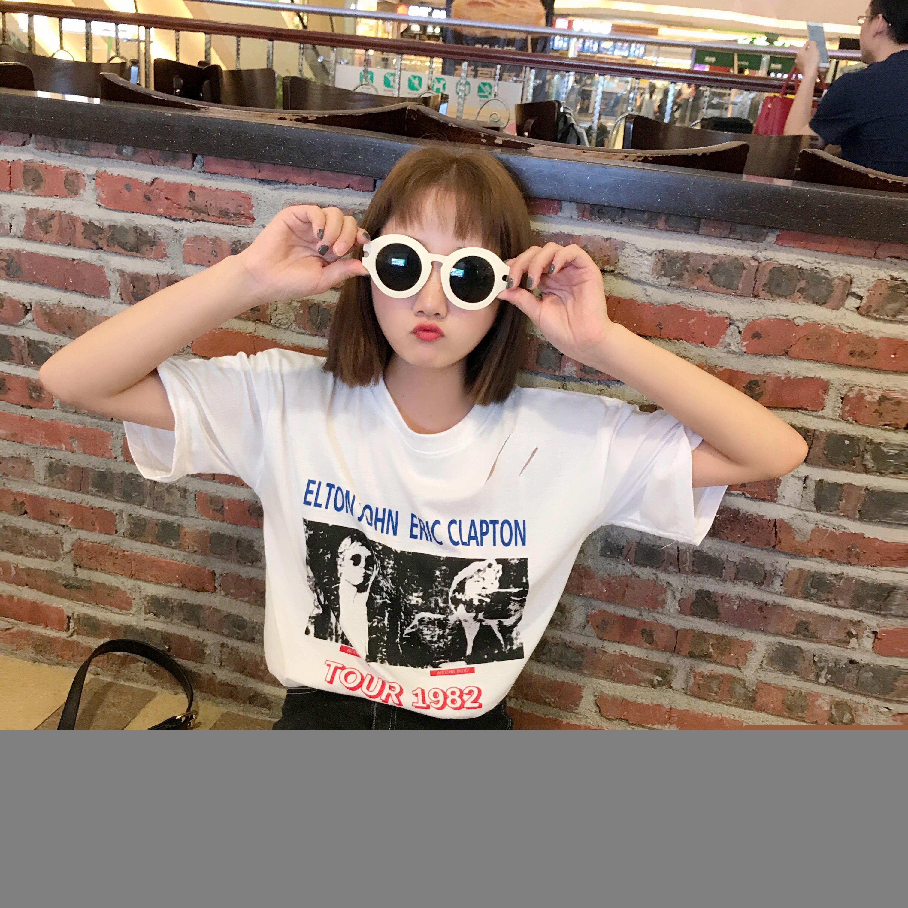夏裝女裝韓版復古人物圖案印花寬松短袖T恤原宿風情侶款上衣學生