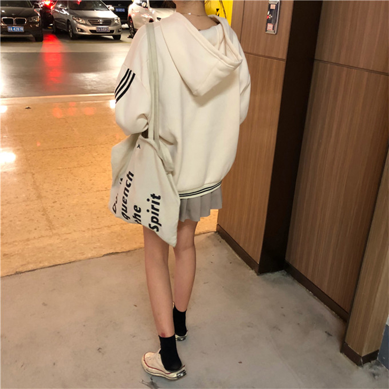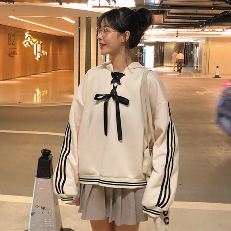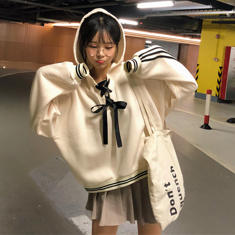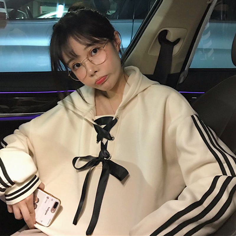 秋冬女裝2018新款韓版學院風條紋長袖加絨衛衣寬松系帶連帽外套潮