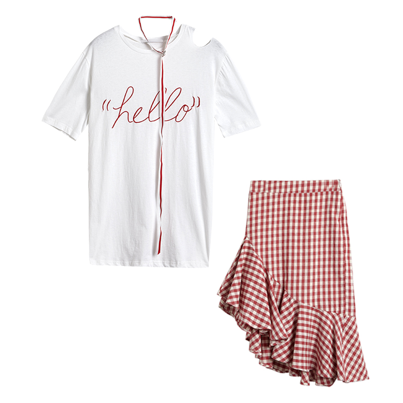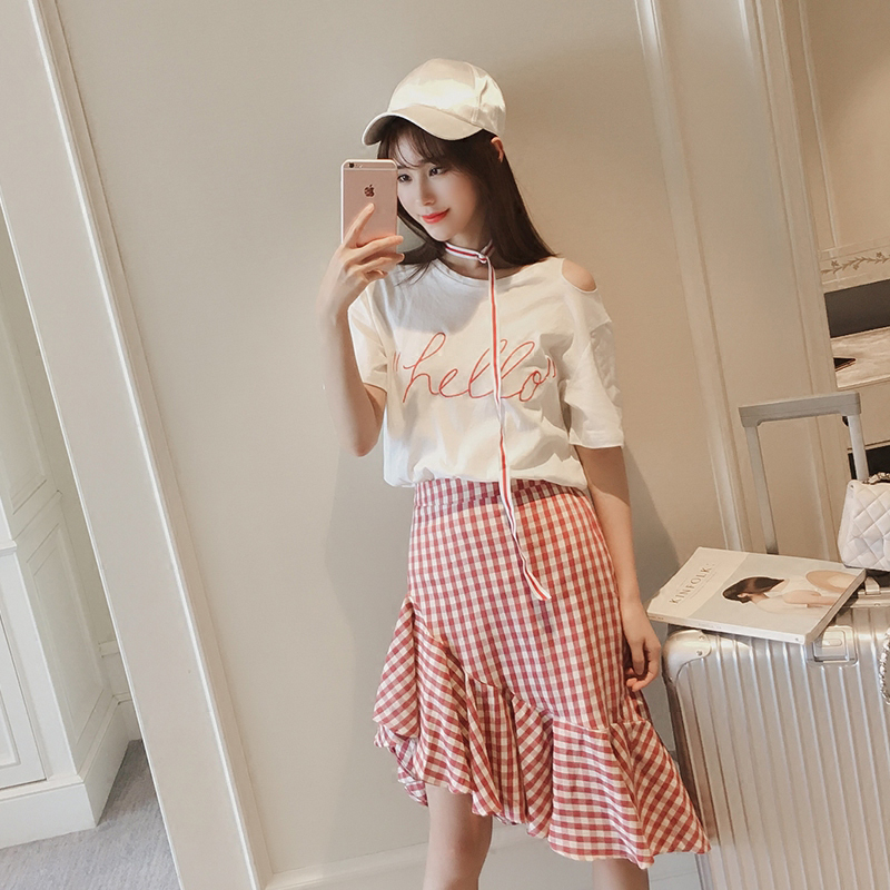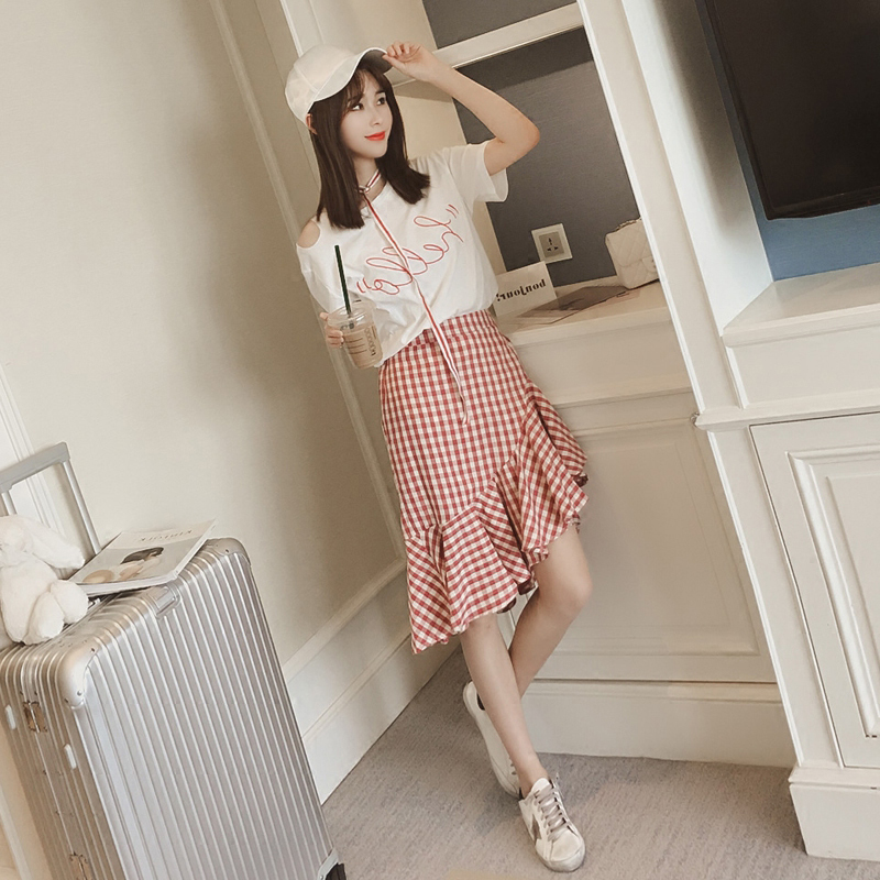 白色T恤+格子魚尾裙
