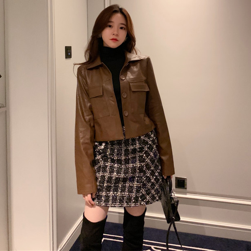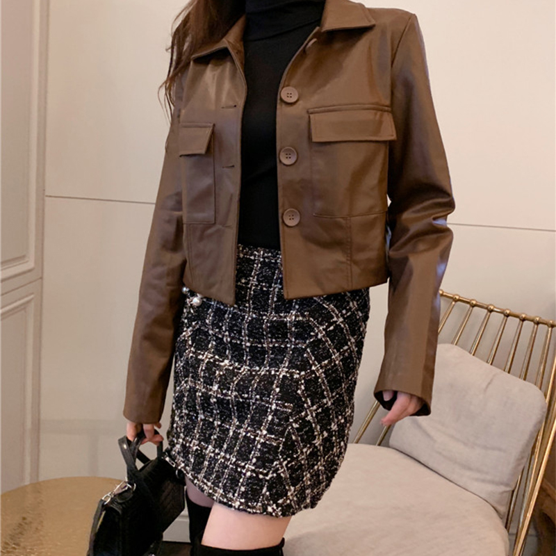 chic港味PU皮夾克女秋冬裝2018新款韓版寬松翻領長袖短款外套上衣