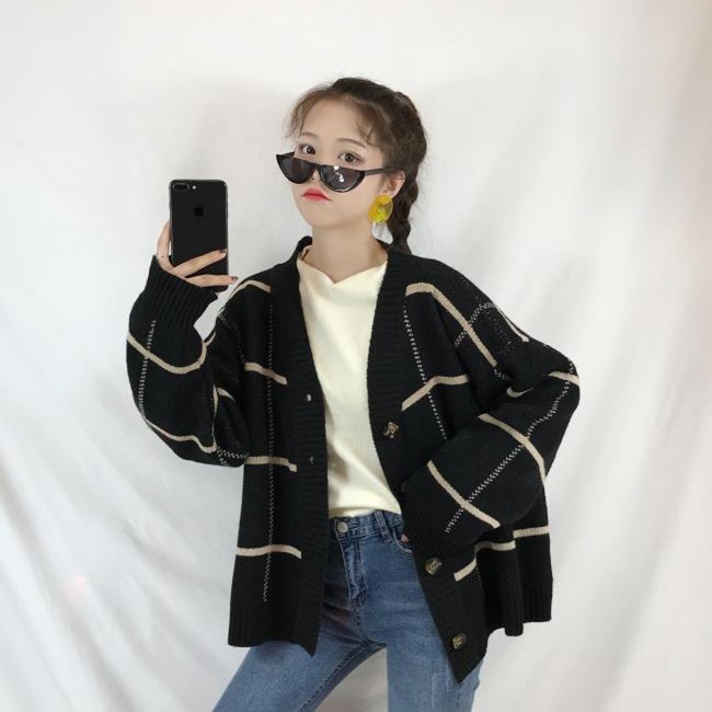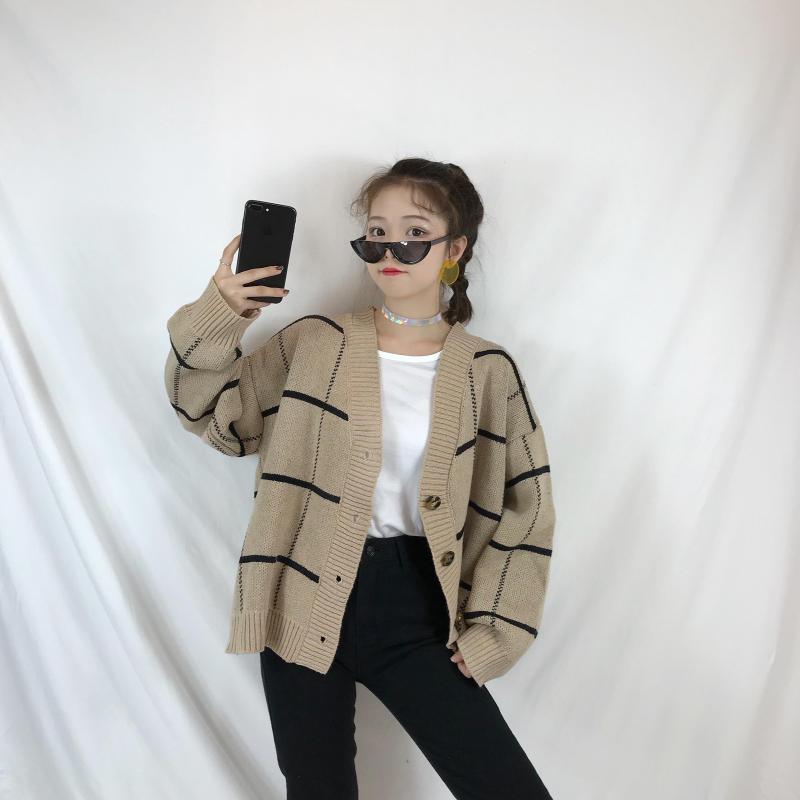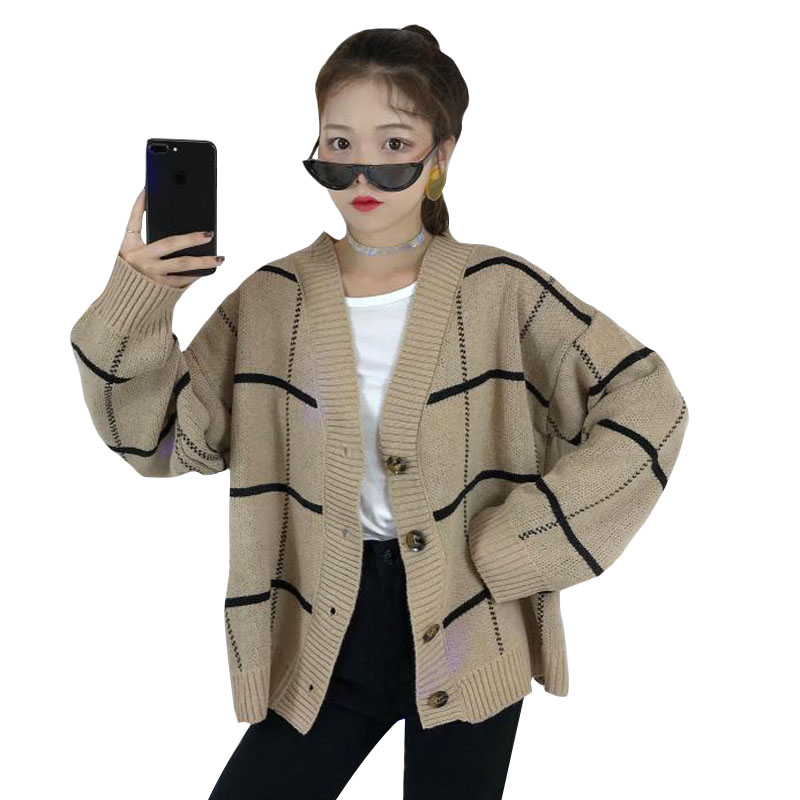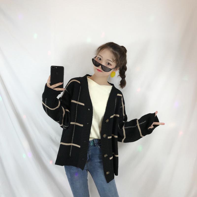 / 秋冬女裝韓版BF風寬松格子開衫毛衣外套中長款長袖休閑針織衫上衣