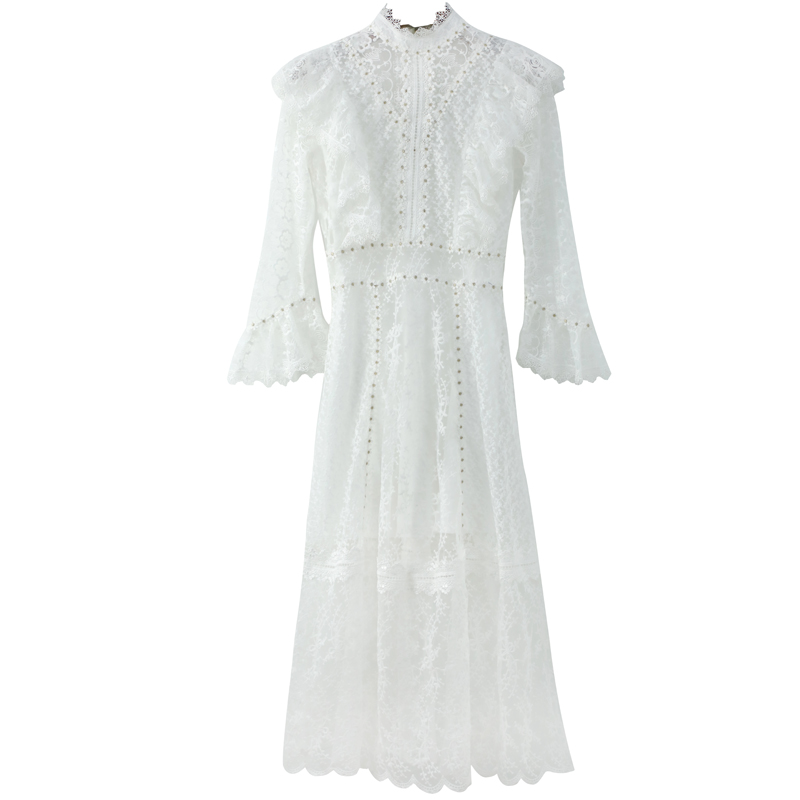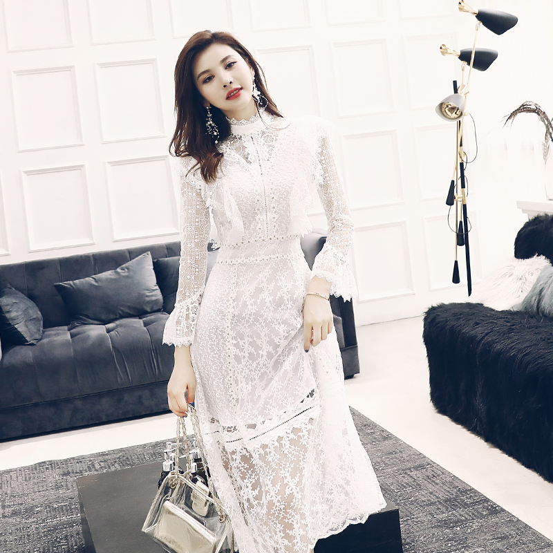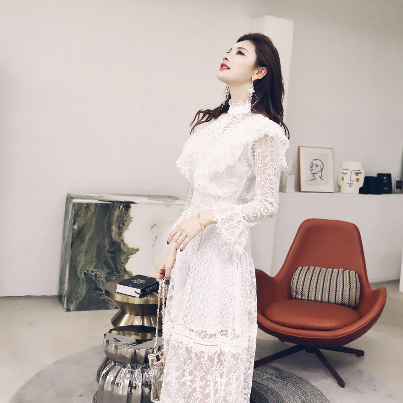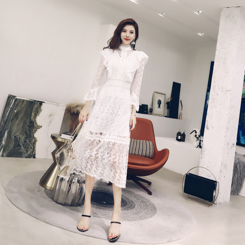白色蕾絲連衣裙女夏季2018新款修身中長款顯瘦溫柔裙子超仙女收腰