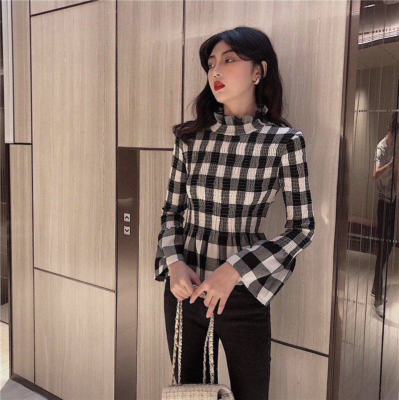 chic秋冬新款韓版打底顯瘦氣質皺褶收腰修身高領喇叭袖格子上衣女