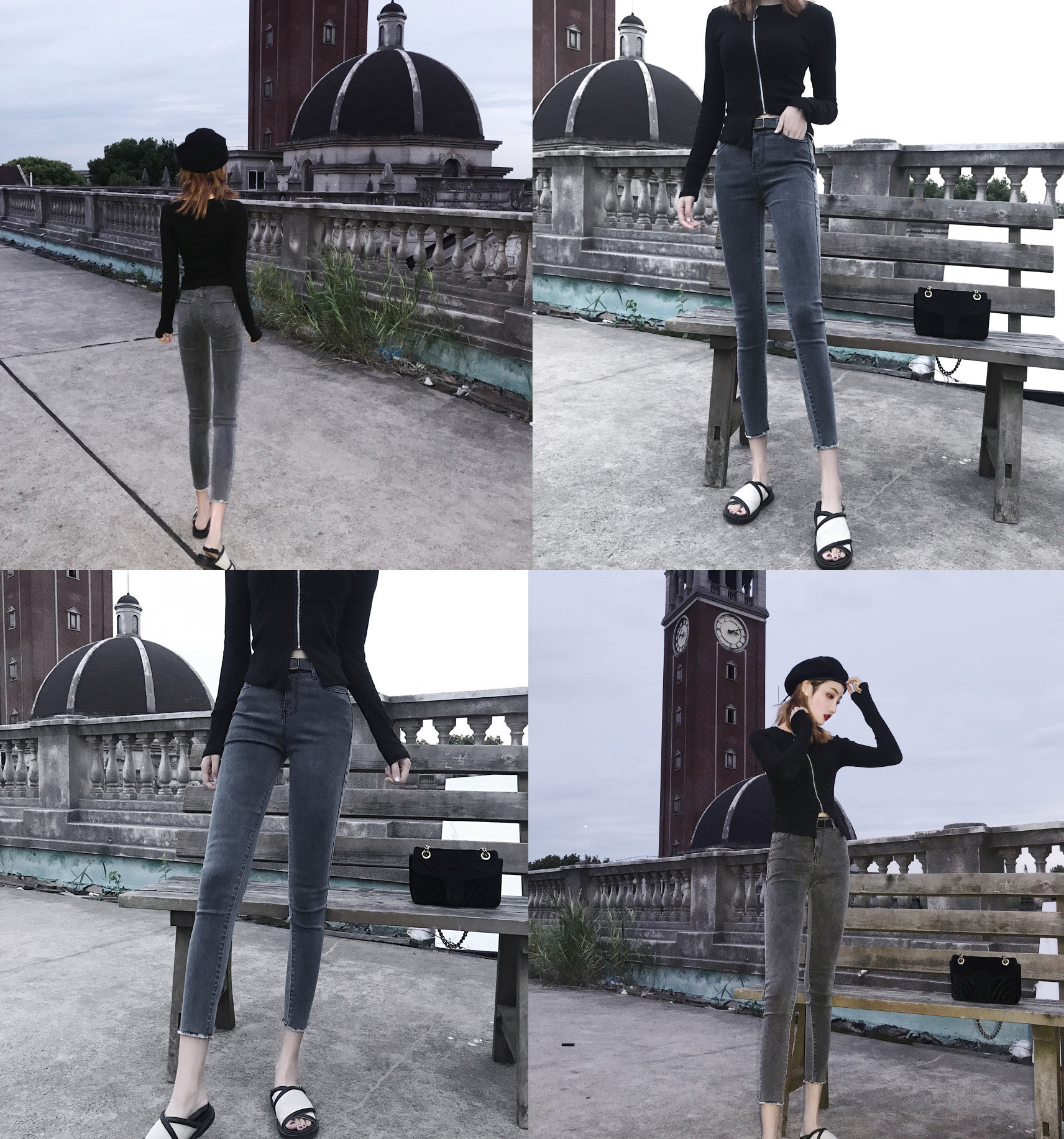 / 秋冬新款chic復古煙灰色破洞高腰顯瘦毛邊牛仔小腳褲鉛筆褲九分褲