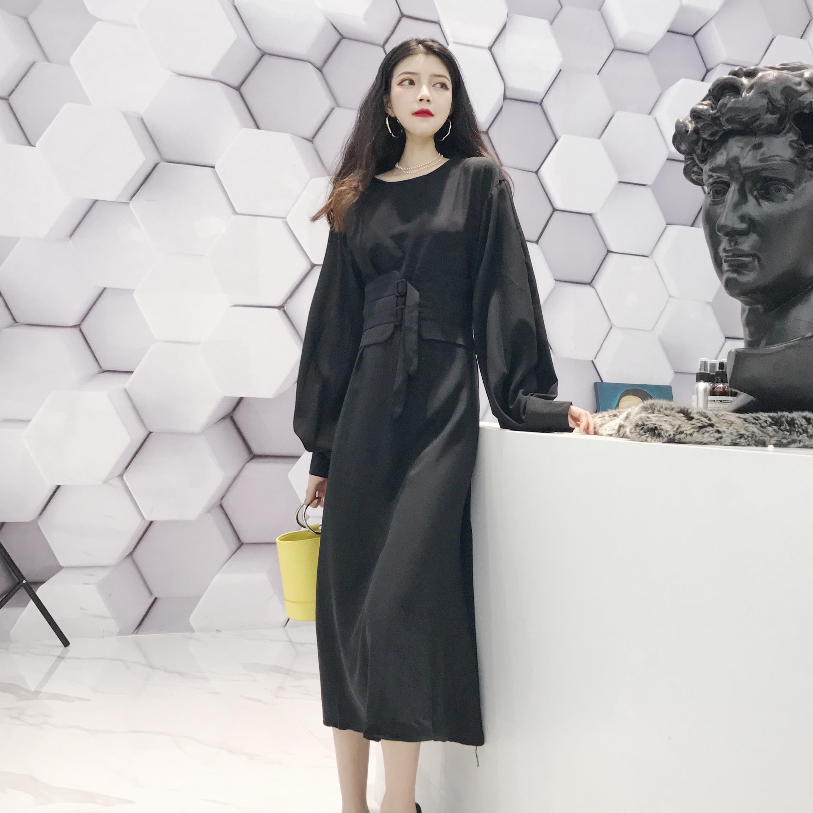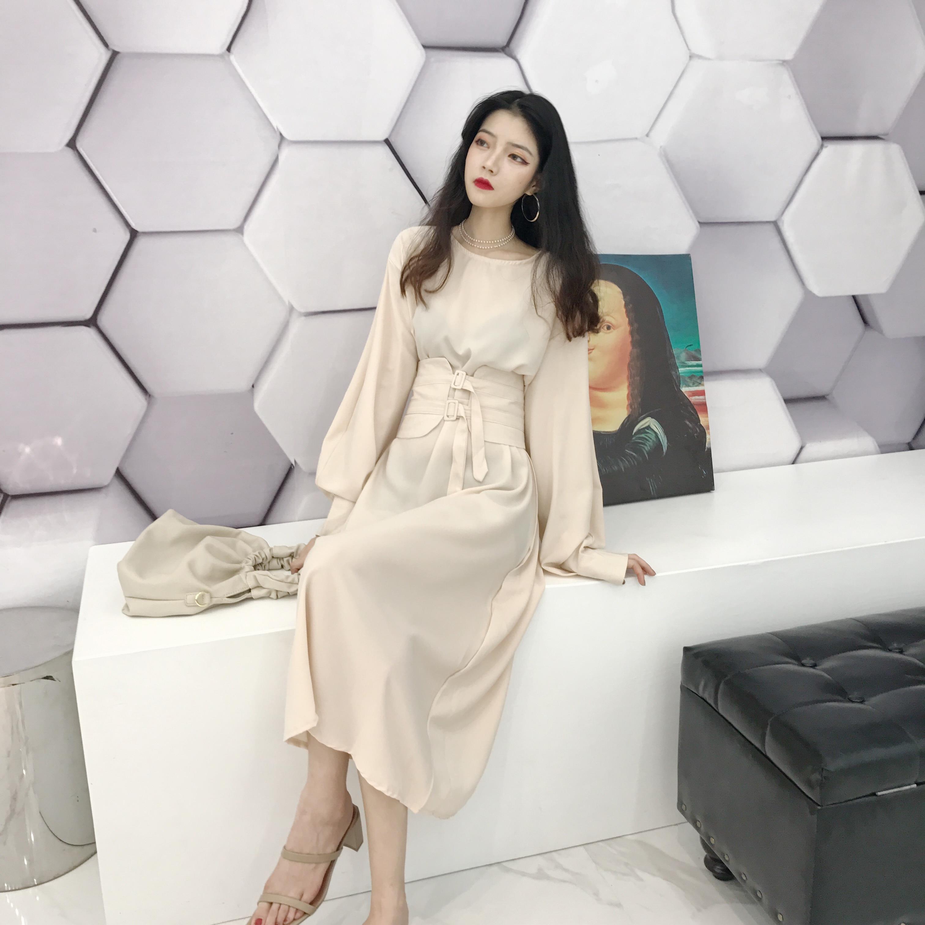 2018初秋新款韓版純色晚晚風簡約時尚百搭長袖綁帶連衣裙中長裙女