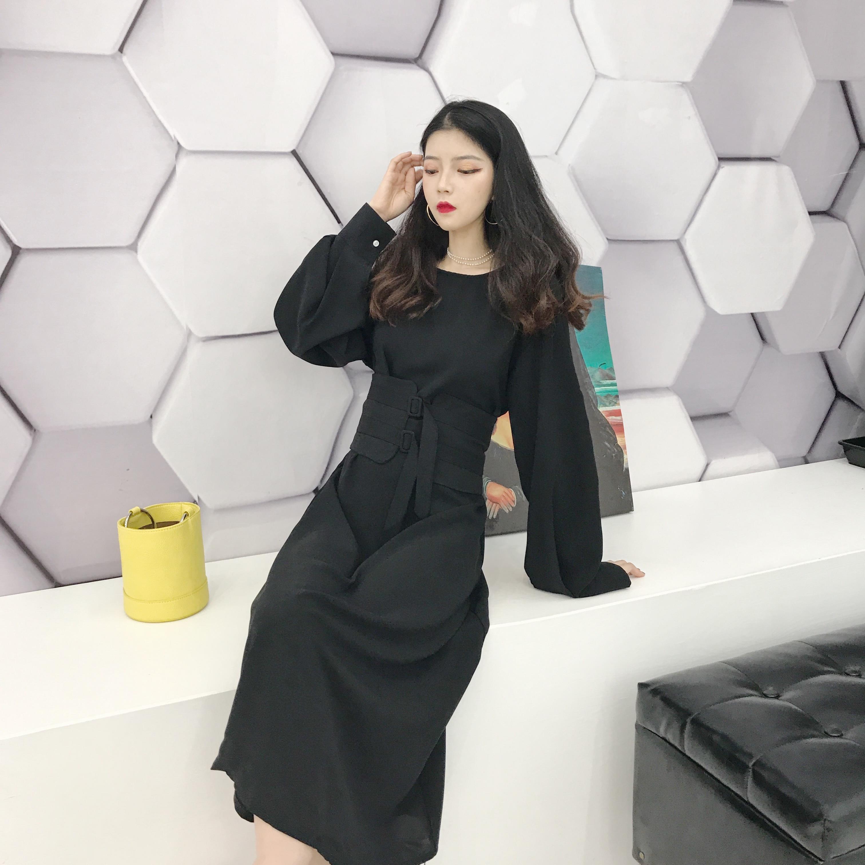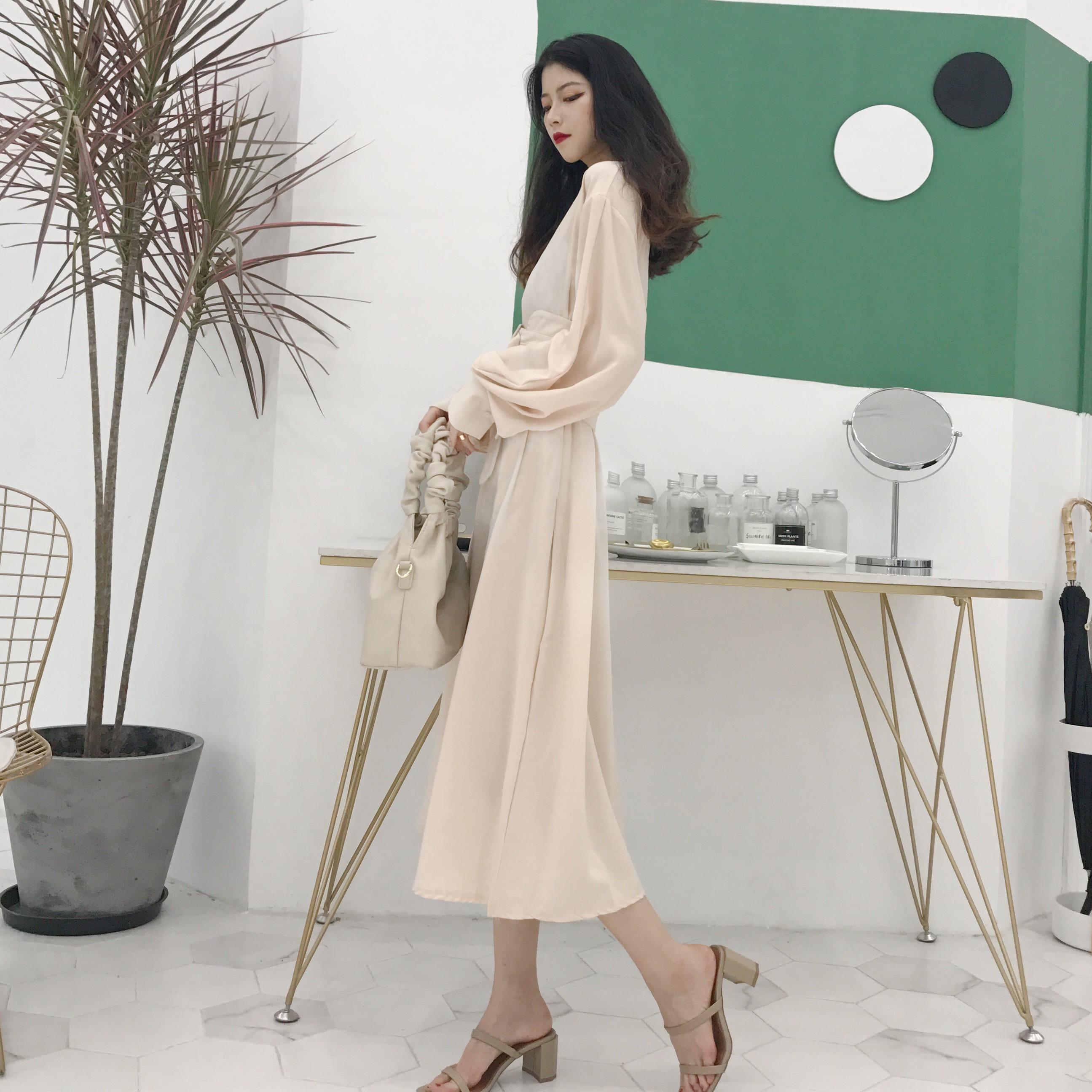 / 2018初秋新款韓版純色晚晚風簡約時尚百搭長袖綁帶連衣裙中長裙女