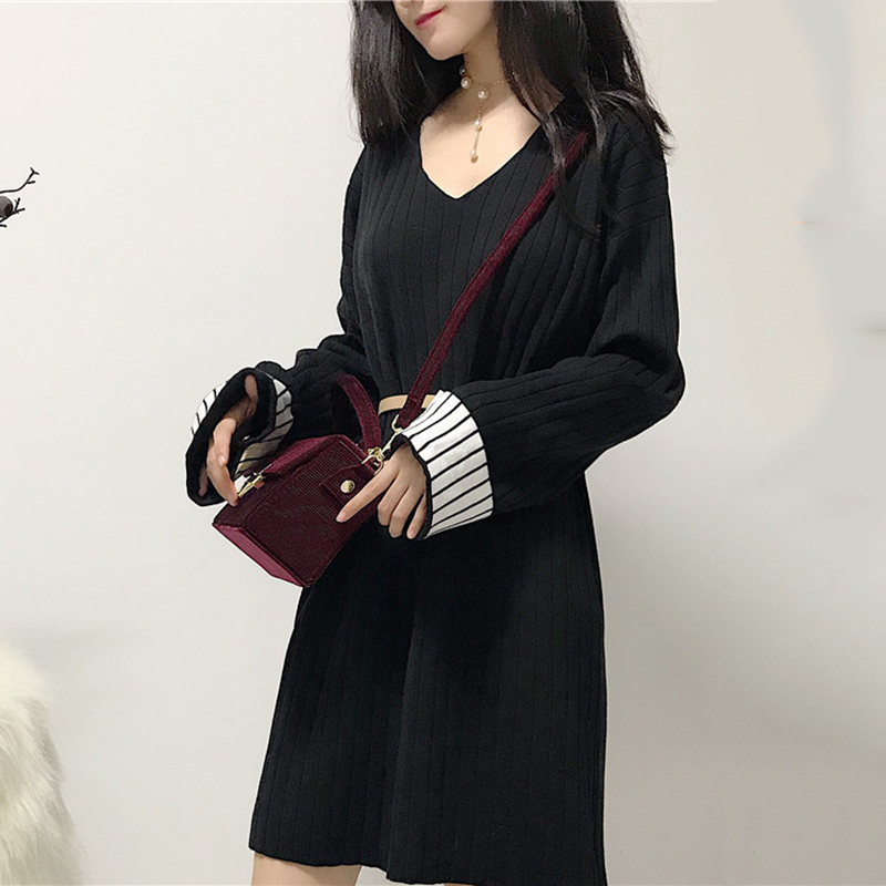秋季女裝2018新款時尚休閑V領針織連衣裙洋氣溫柔撞色長袖A字裙子