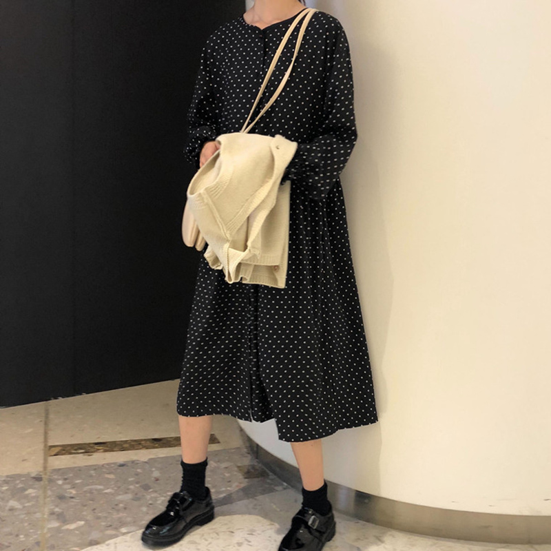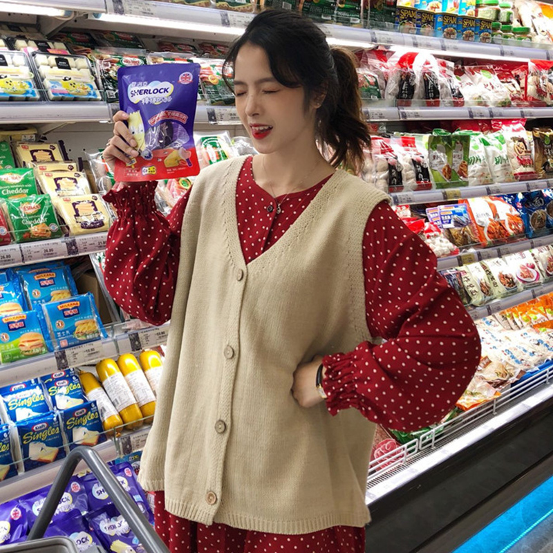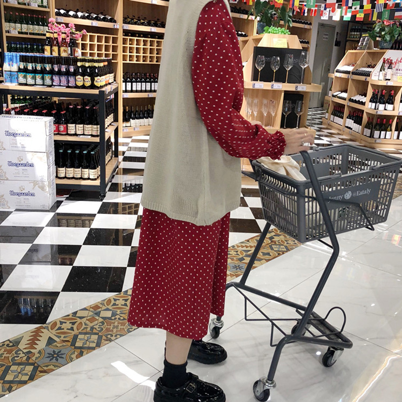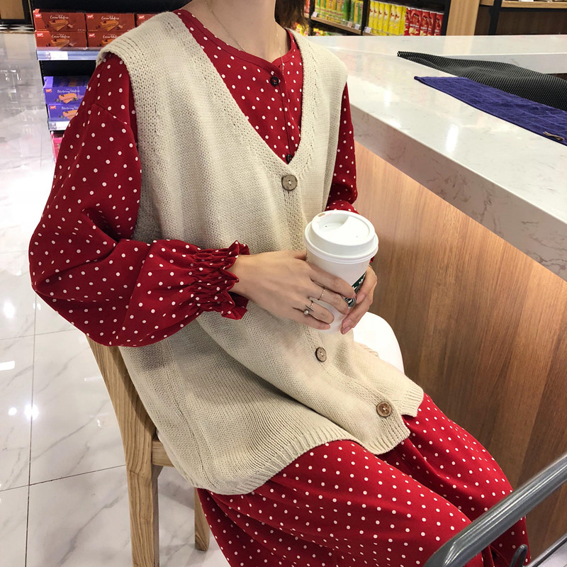 / 韓版學生套裝女秋新款寬松顯瘦波點中長連衣裙子針織馬甲開衫外套