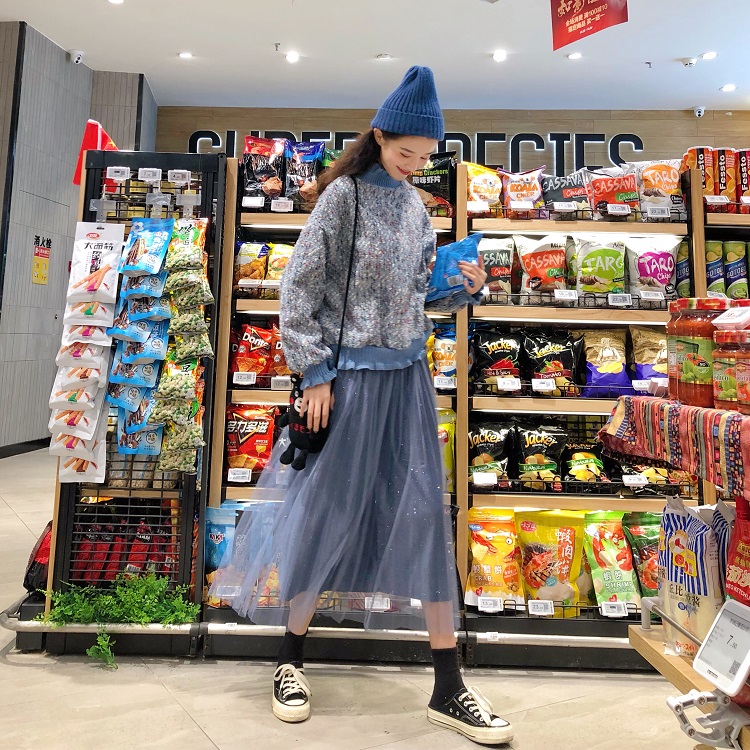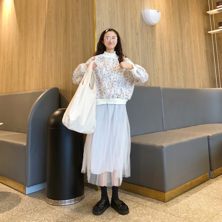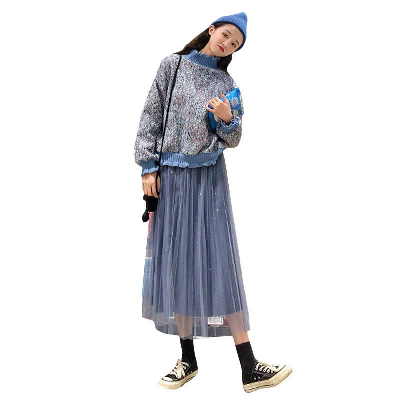 / 韓版時尚休閑套裝秋季粗花呢衛衣外套+中長款網紗半身裙兩件套女