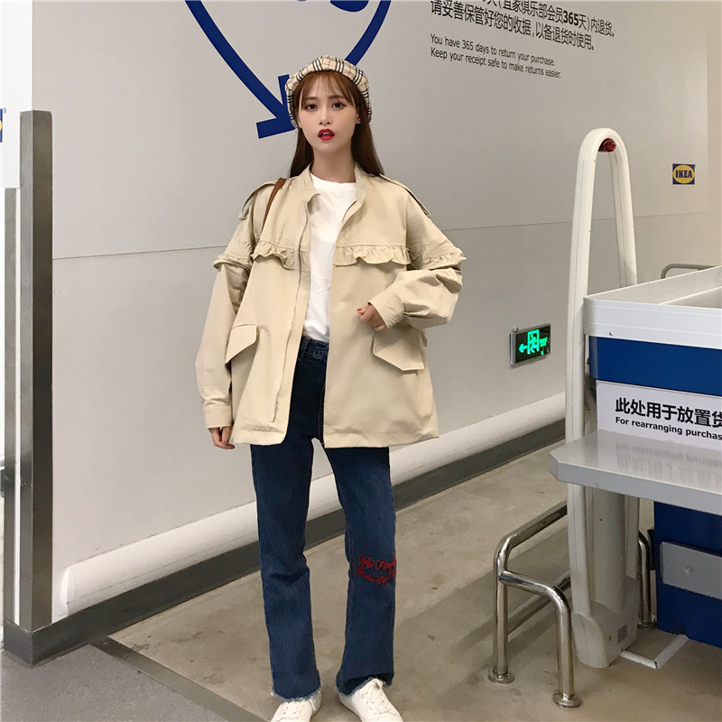 秋季女裝2018新款韓版復古工裝中長款木耳邊休閑寬松夾克上衣外套