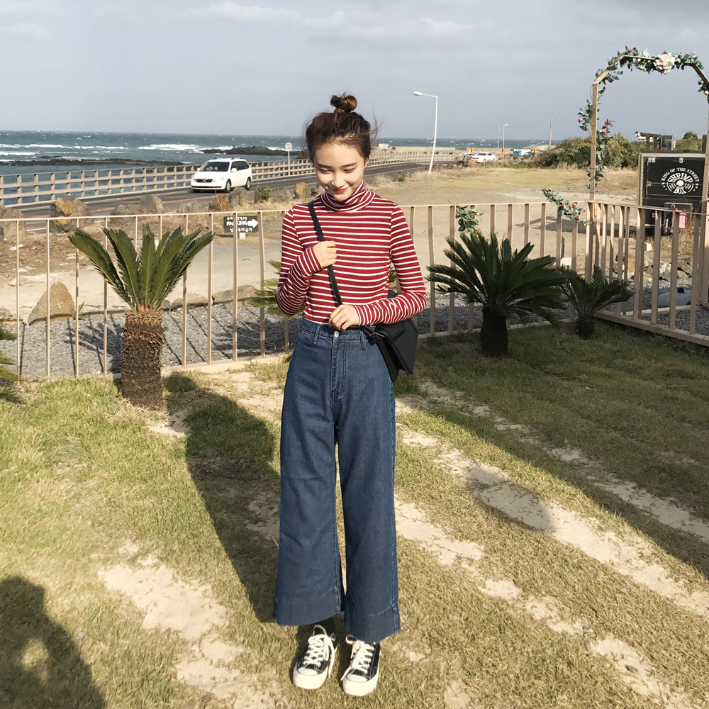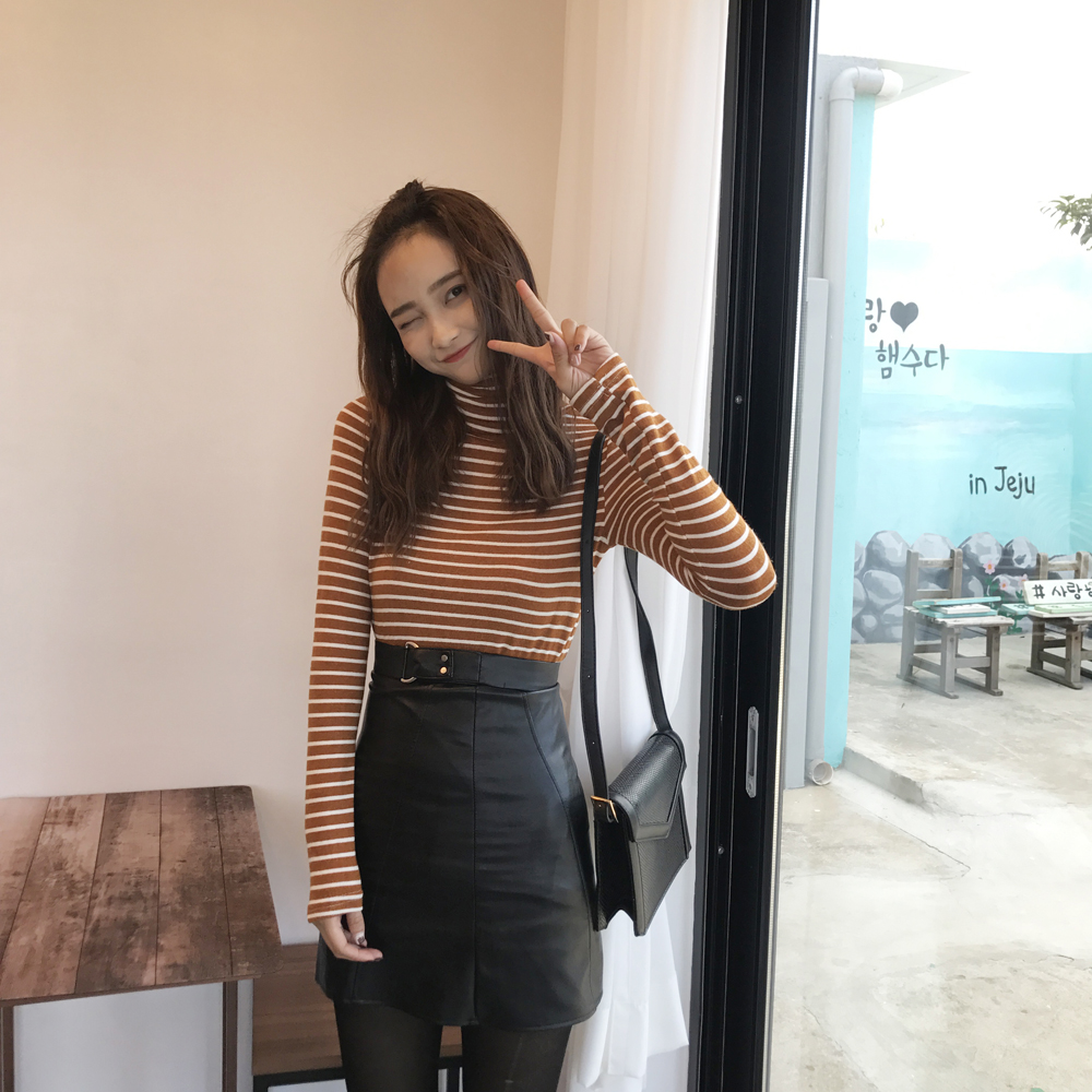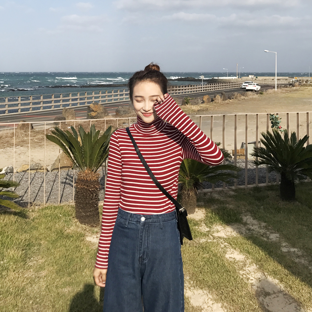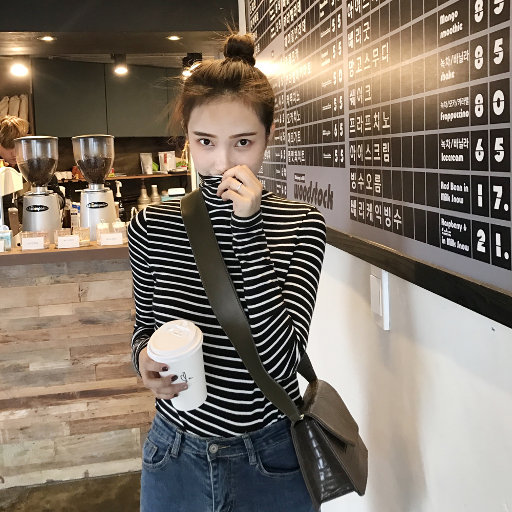秋裝女2018新款韓版修身顯瘦條紋高領打底衫長袖T恤港風百搭上衣