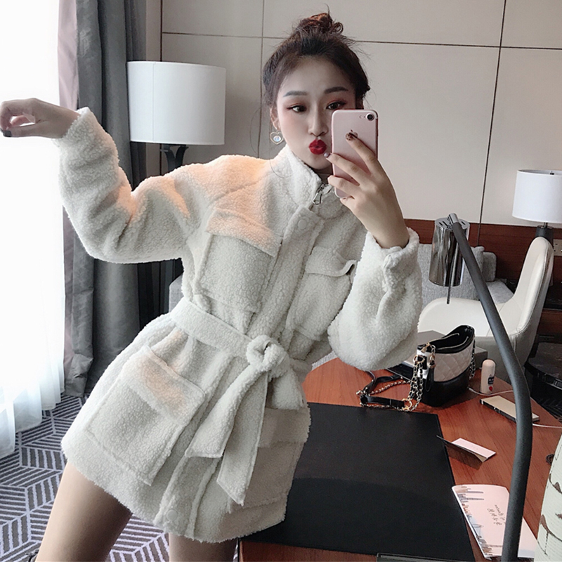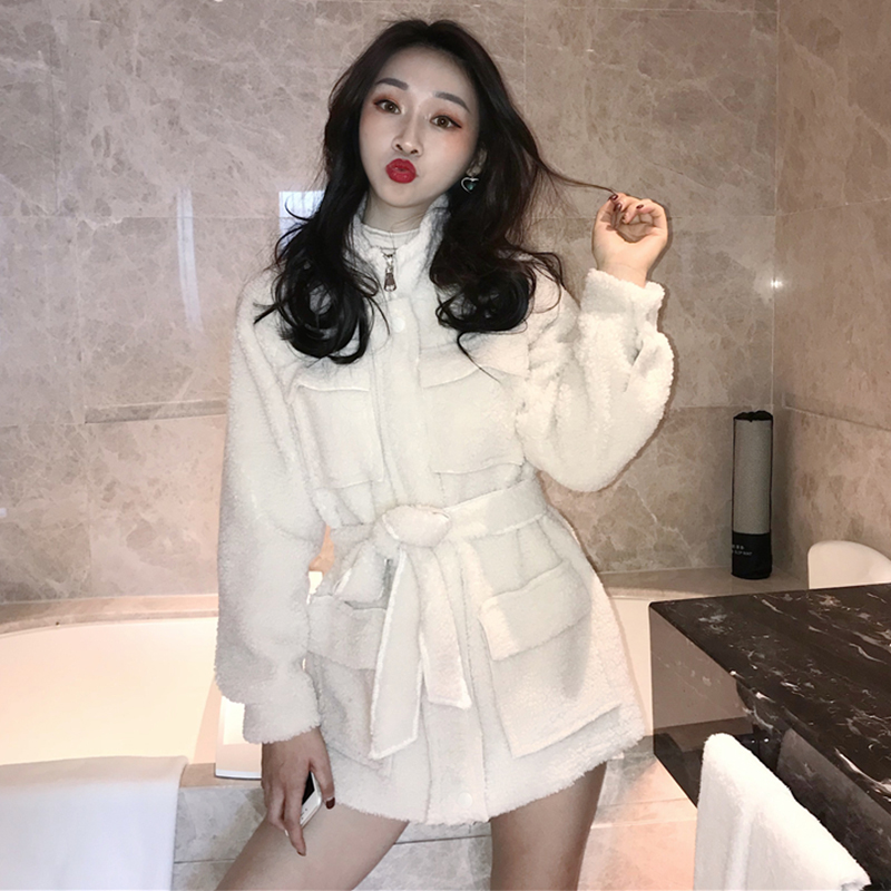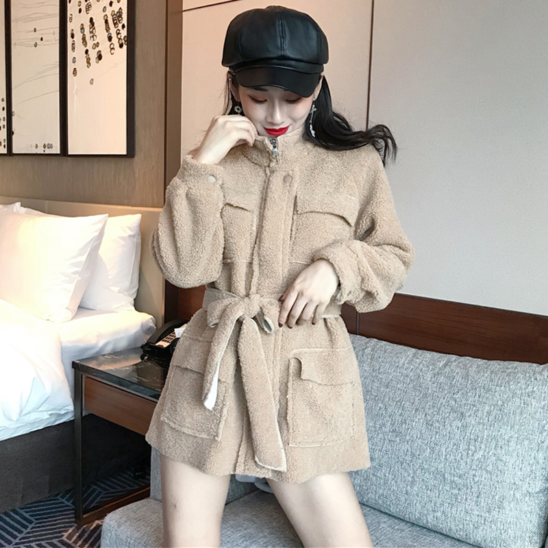 chic中長款棉衣服女秋冬裝2018新款韓版高領系帶收腰顯瘦毛絨外套
