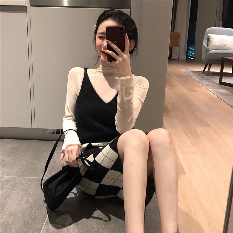 / 復古女神套裝秋冬新款馬海毛小吊帶+網紗打底衫女+菱形針織高腰裙